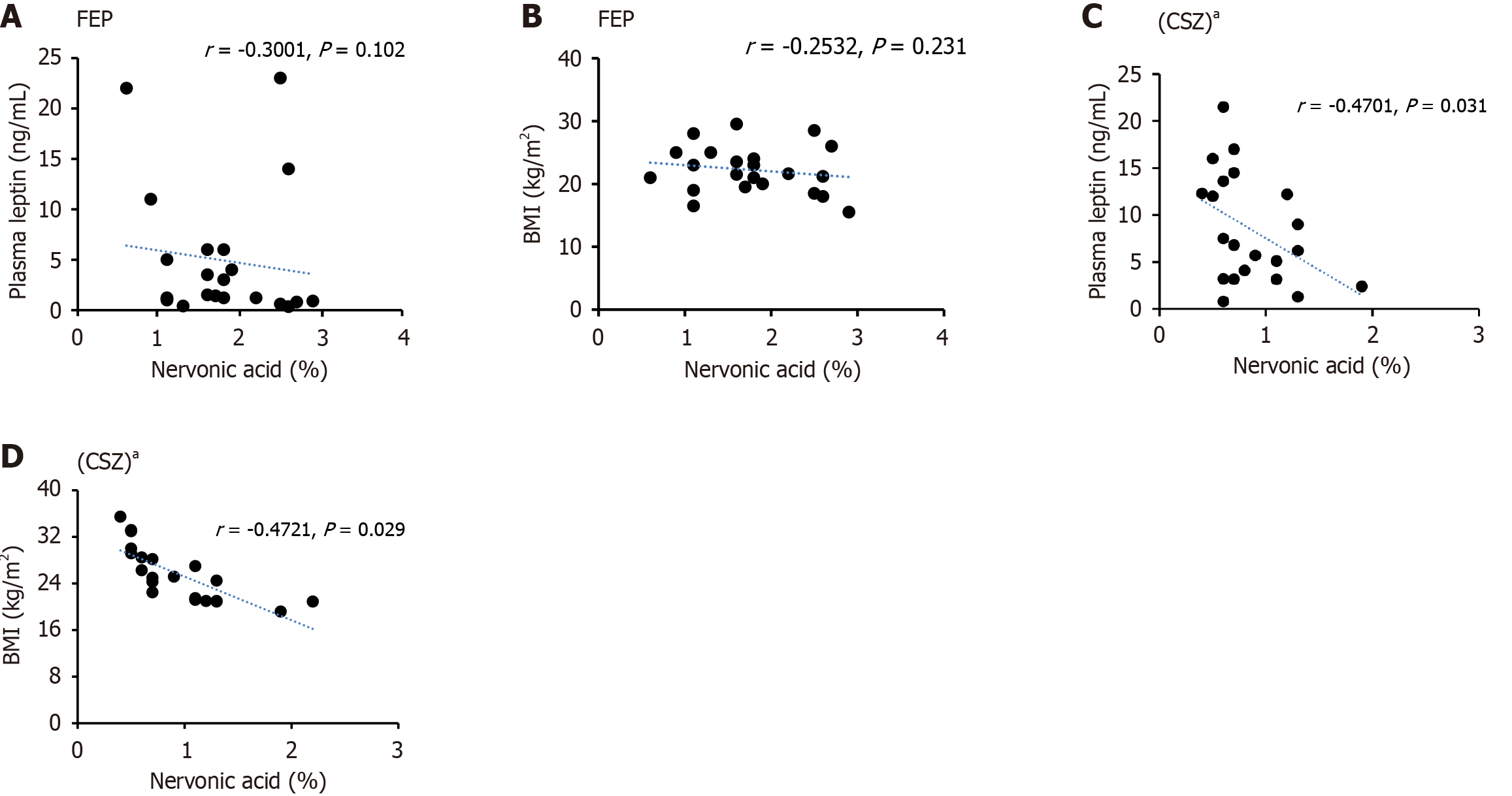 Figure 2 Association of erythrocyte membrane nervonic acid with plasma leptin and body mass index in schizophrenia.aP < 0.05 was considered significant. A: In patients with first-episode psychosis, erythrocyte membrane nervonic acid (NA) did not show significant association with plasma leptin; B: In patients with first-episode psychosis, erythrocyte membrane NA did not show significant association with body mass index; C: In medicated patients with chronic schizophrenia, erythrocyte membrane NA showed significant negative association with plasma leptin; D: In medicated patients with chronic schizophrenia, erythrocyte membrane NA showed significant negative association with body mass index. FEP: First-episode psychosis; CSZ: Chronic schizophrenia.