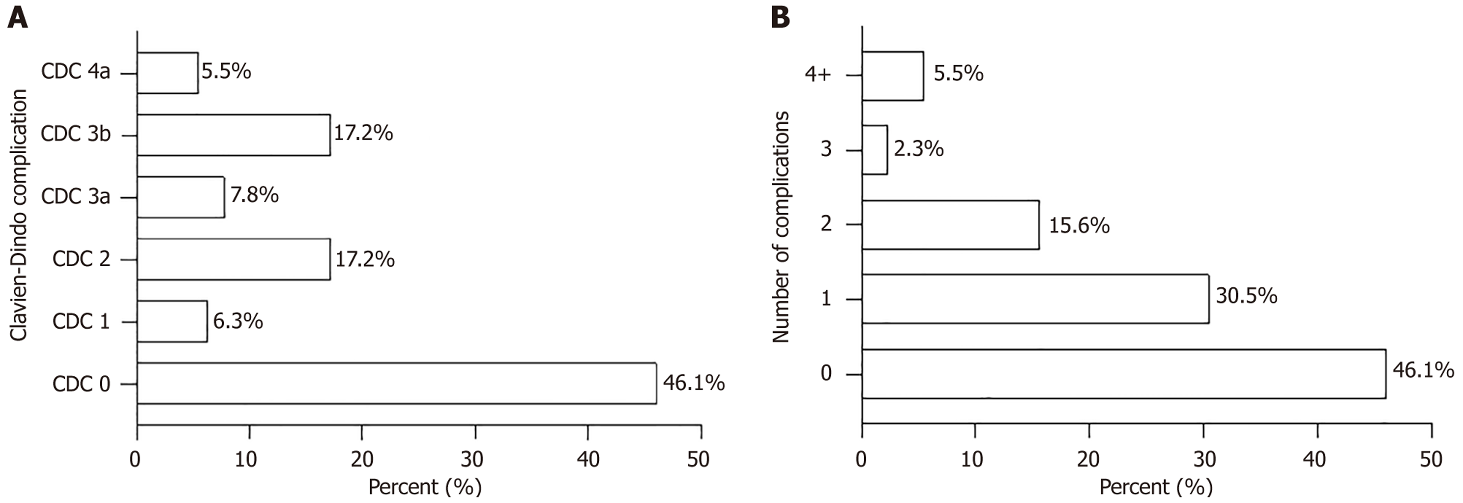A: Percent of Clavien-Dindo classification 0-5 complications; B: Number of complications per patient. There were no Clavien-Dindo classification 4b or 5 complications. CDC: Clavien-Dindo classification.