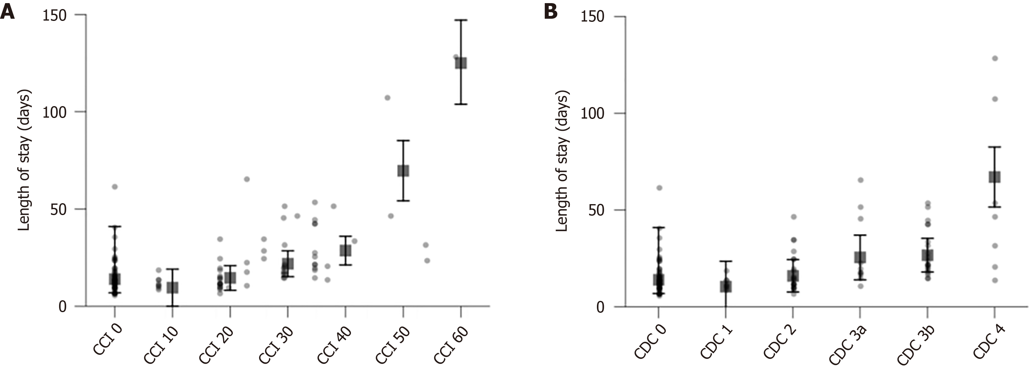 The analysis is based on all patients undergoing simultaneous pancreas-kidney (n = 128). Points represent the median hospital stay with error bars representing 95% confidence intervals. A: The comprehensive complication index was divided into five subgroups, with points plotted based on averaging the comprehensive complication index value; B: For the Clavien-Dindo classification grade, this treats each grade as a subgroup; CCI: Comprehensive complication index; CDC: Clavien-Dindo classification.