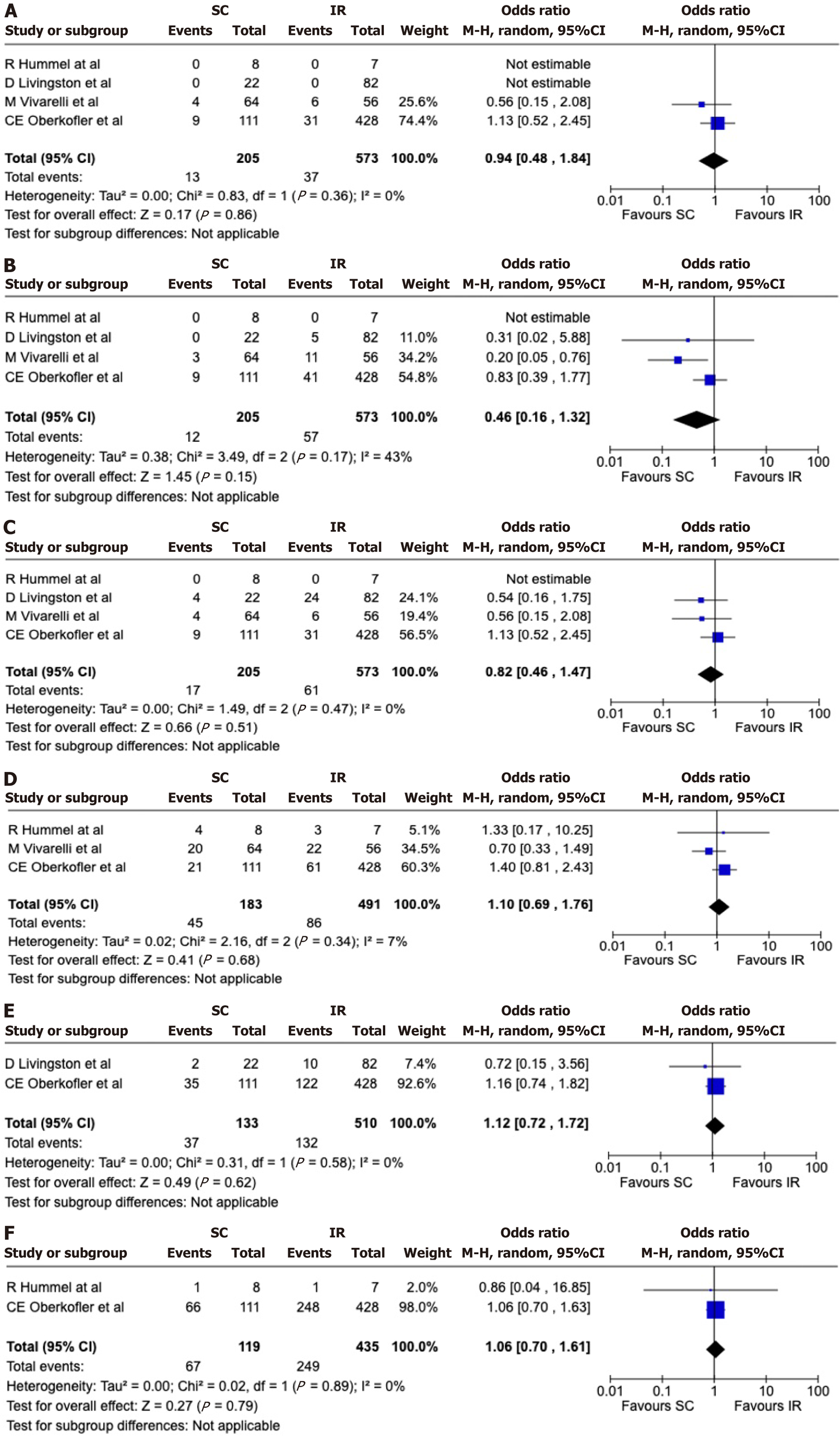 A: For early occlusions comparing supra-coeliac with infra-renal aorto-hepatic conduits; B: For late occlusions comparing supra-coeliac with infra-renal aorto-hepatic conduits; C: For early allograft dysfunction comparing supra-coeliac with infra-renal aorto-hepatic conduits; D: For biliary complications comparing supra-coeliac with infra-renal aorto-hepatic conduits; E: For post-transplant renal replacement therapy comparing supra-coeliac with infra-renal aorto-hepatic conduits; F: For major surgical complications (Clavien-Dindo 3b >) comparing supra-coeliac with infra-renal aorto-hepatic conduits. IR: Infra-renal; SC: Supra-coeliac.
