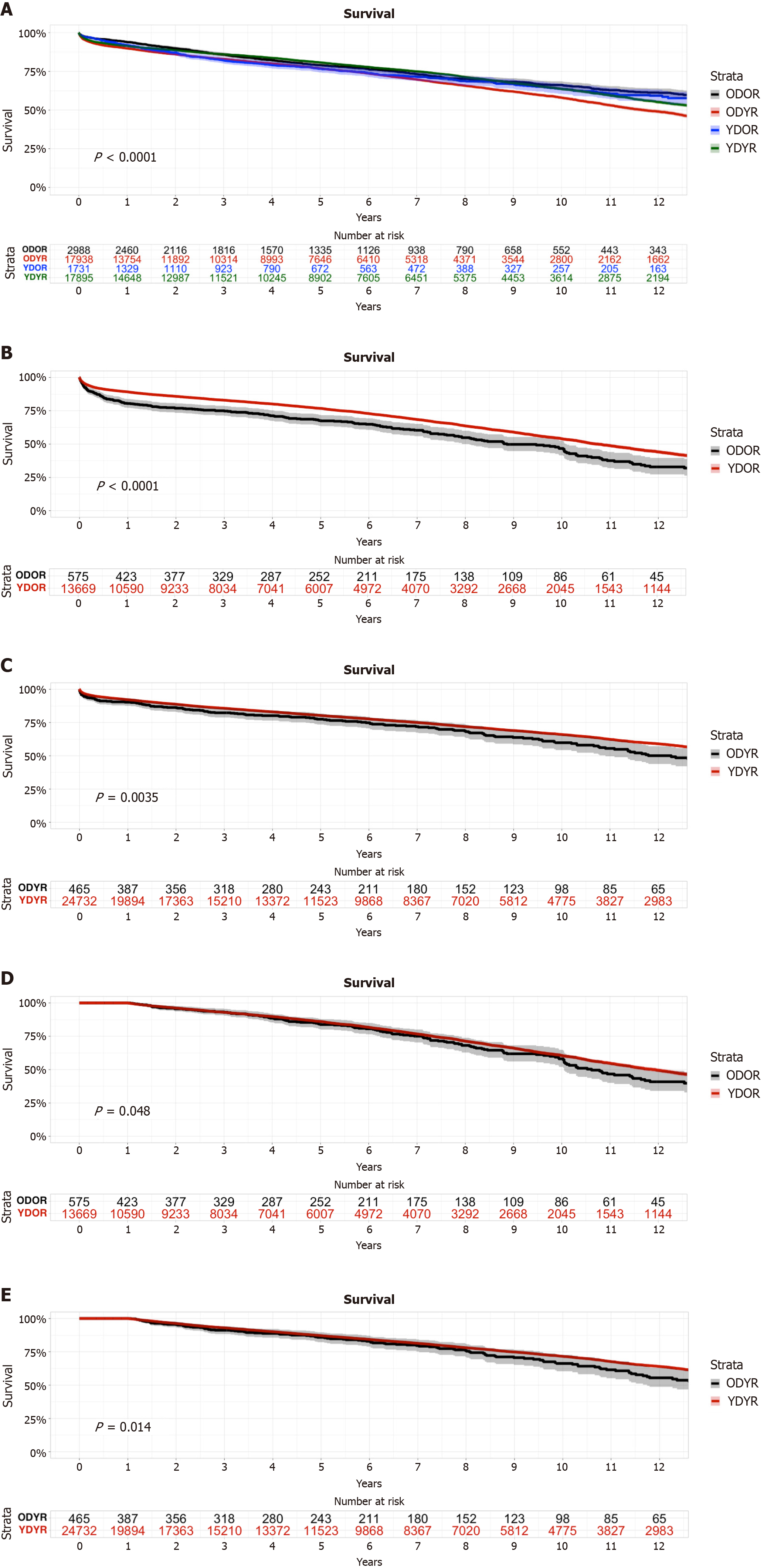 A: Across all four age groups; B: In the isolated old recipient population; C: In the isolated young recipient population; D: In the isolated old recipient population (excluding zero to 1 year); E: In the isolated young recipient population (excluding zero to 1 year). ODOR: Old donor/old recipient; ODYR: Old donor/young recipient; YDYR: Young donor/young recipient; YDOR: Young donor/old recipient.