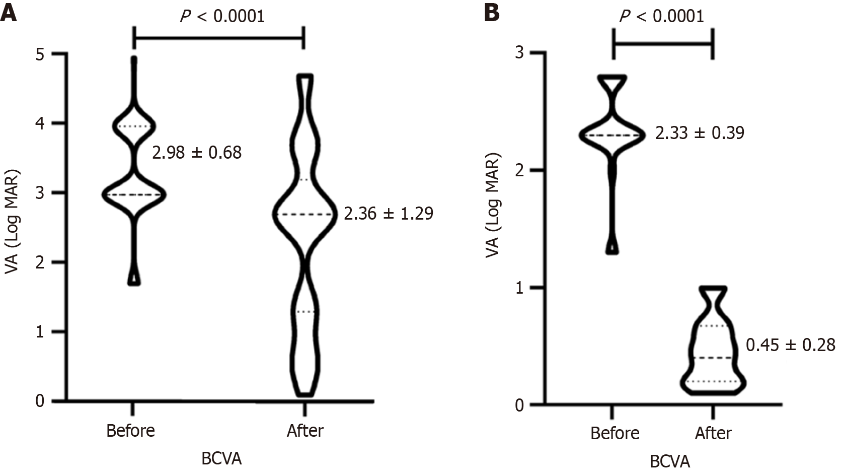 A and B: Visual acuity improvement in 99 patients with uncorrected visual acuity (A) and 24 patients with best corrected visual acuity (B). BCVA: Best corrected visual acuity; VA: Visual acuity.