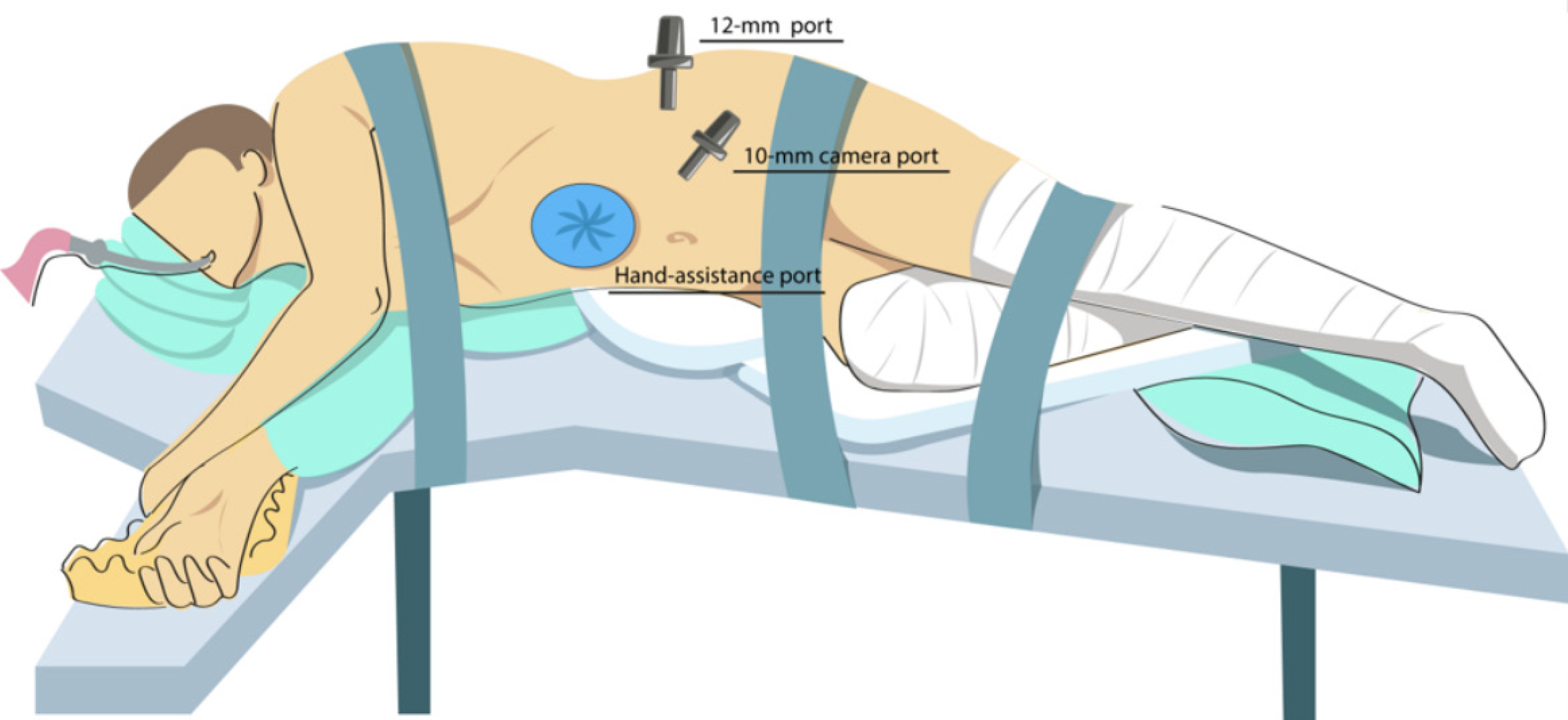 The patient is placed in a modified lateral decubitus position with flexion at the level of the iliac crest to increase the working space between the costal margin and the iliac spine. The upper arm is supported with an armrest, and all extremities are padded and secured. The hand-assist port is placed via a periumbilical incision. Additional laparoscopic ports are positioned under direct vision: One working port in the upper quadrant, and another in the lower quadrant for the camera. This setup allows optimal access for kidney mobilization, vascular dissection, and safe extraction through the hand-assist site.