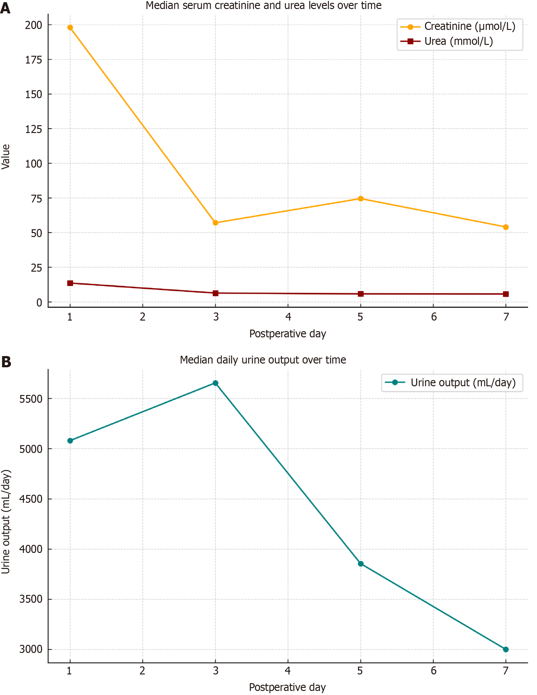 A: Median serum creatinine and urea levels on postoperative days 1, 3, 5, and 7. Both markers demonstrated a progressive decline, reflecting early recovery of graft function; B: Median daily urine output over the same period. Urine output peaked on day 3, consistent with the expected polyuric phase, and gradually decreased by day 7 while remaining above the normal range.