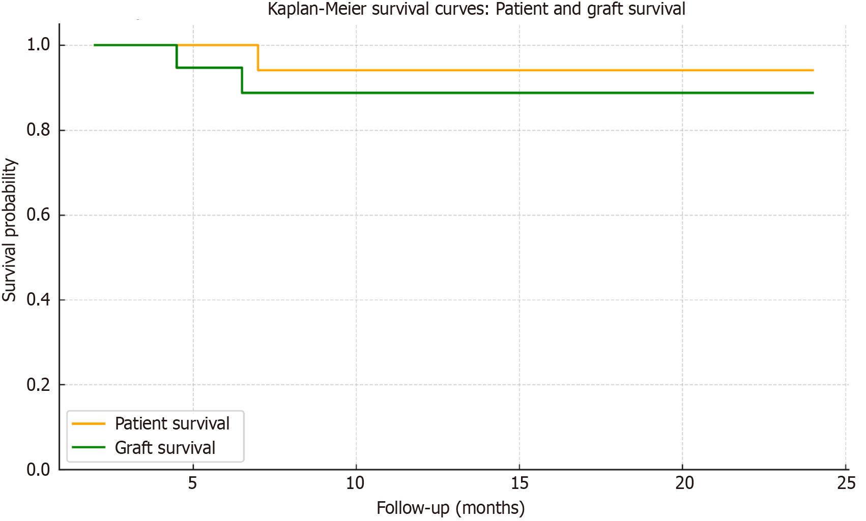The orange curve represents overall patient survival, and the green curve shows graft survival during the follow-up period. One death and two cases of graft loss occurred. Both survival rates remained above 90% at 24 months.