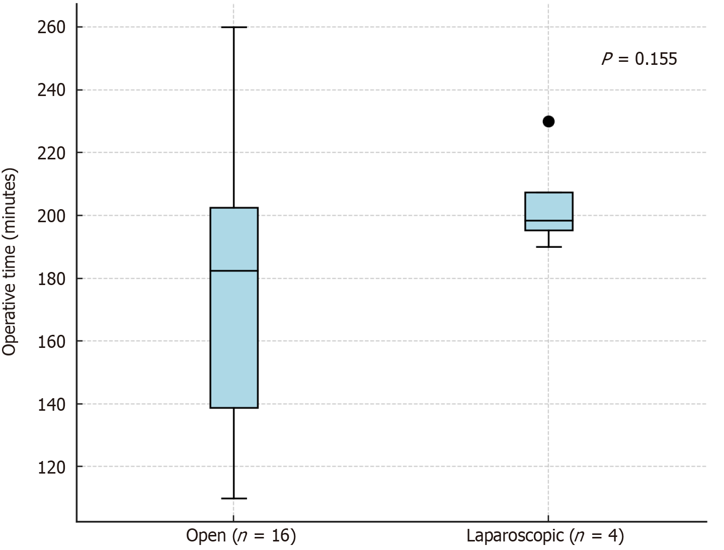 The graph compares operative duration between open donor nephrectomy (n = 16) and laparoscopic hand-assisted donor nephrectomy (n = 4). Median operative times were 182.5 minutes and 198.5 minutes, respectively. Differences were not statistically significant due to the limited sample size.