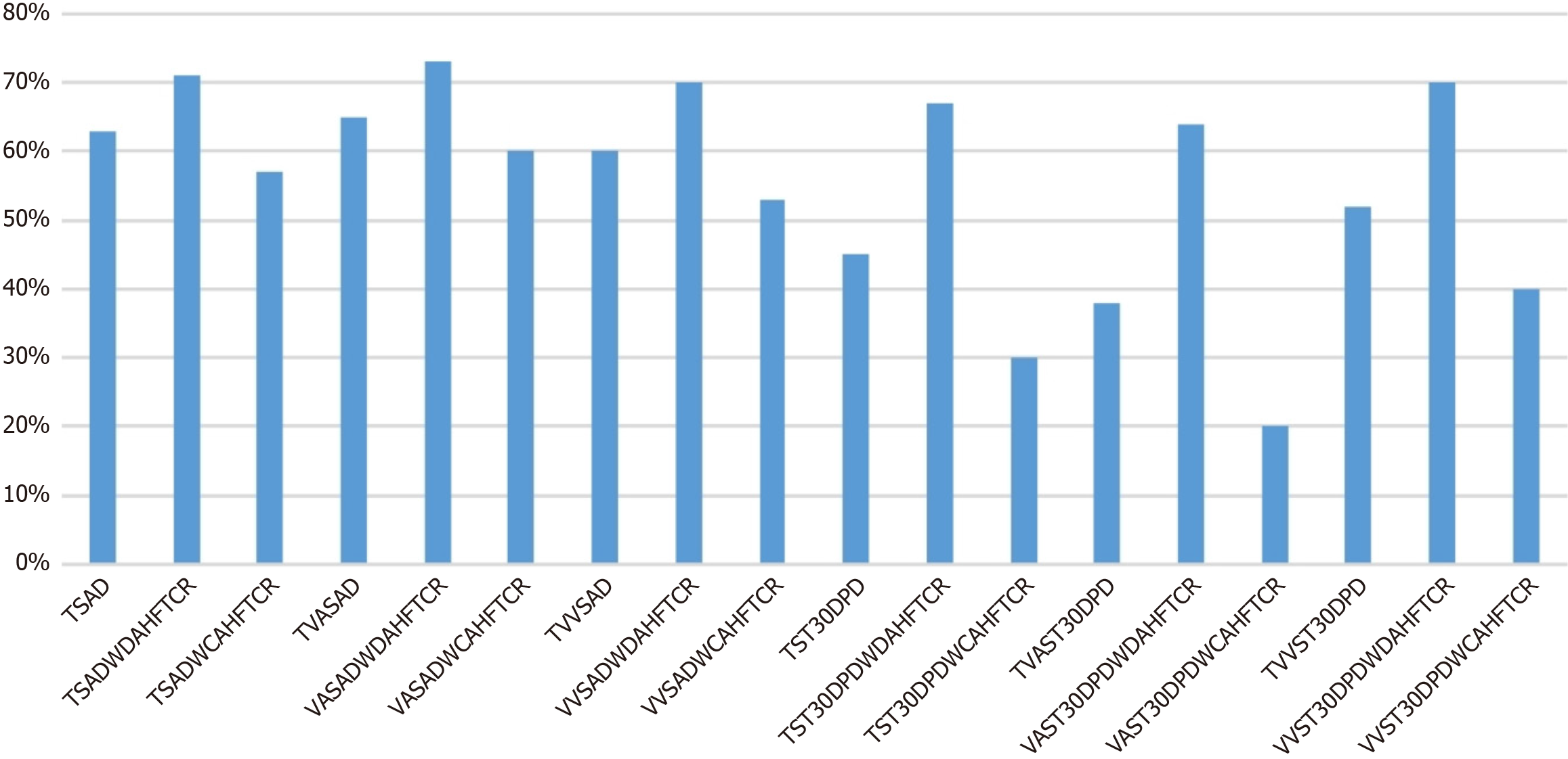 TSAD: Total survival after decannulation; TSADWCAHFTCR: Total survival after decannulation with consultative advanced heart failure and transplant cardiology role; TSADWDAHFTCR: Total survival after decannulation with direct advanced heart failure and transplant cardiology role; TST30DPD: Total survival to 30 days post discharge; TST30DPDWCAHFTCR: Total survival to 30 days post discharge with consultative advanced heart failure and transplant cardiology role; TST30DPDWDAHFTCR: Total survival to 30 days post discharge with direct advanced heart failure and transplant cardiology role; TVASAD: Total veno-arterial survival after decannulation; TVAST30DPD: Total veno-arterial survival to 30 days post discharge; TVVSAD: Total veno-venous survival after decannulation; TVVST30DPD: Total veno-venous survival to 30 days post discharge; VASADWCAHFTCR: Veno-arterial survival after decannulation with consultative advanced heart failure and transplant cardiology role; VASADWDAHFTCR: Veno-arterial survival after decannulation with direct advanced heart failure and transplant cardiology role; VAST30DPDWCAHFTCR: Veno-arterial survival to 30 days post discharge with consultative advanced heart failure and transplant cardiology role; VAST30DPDWDAHFTCR: Veno-arterial survival to 30 days post discharge with direct advanced heart failure and transplant cardiology role; VVSADWCAHFTCR: Veno-venous survival after decannulation with consultative advanced heart failure and transplant cardiology role; VVSADWDAHFTCR: Veno-venous survival after decannulation with direct advanced heart failure and transplant cardiology role; VVST30DPDWCAHFTCR: Veno-venous survival to 30 days post discharge with consultative advanced heart failure and transplant cardiology role; VVST30DPDWDAHFTCR: Veno-venous survival to 30 days post discharge with direct advanced heart failure and transplant cardiology role.