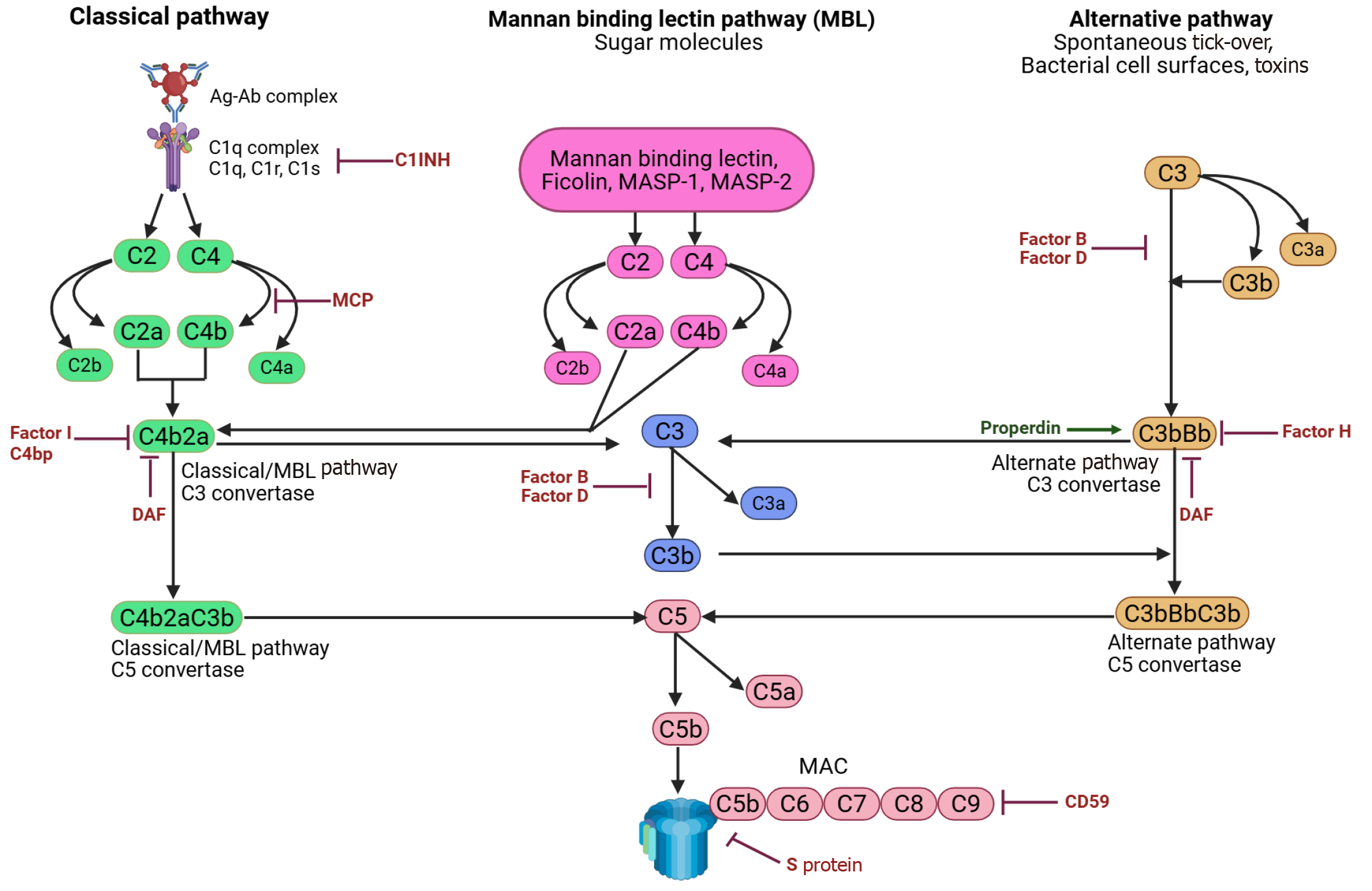 Ag-Ab: Antigen-antibody; C1inh: C1 esterase inhibitor; MASP-1: Mannan-binding lectin-associated serine protease-1; MASP-2: Mannan-binding lectin-associated serine protease-2; MCP: Membrane cofactor protein; DAF: Decay accelerating factor.