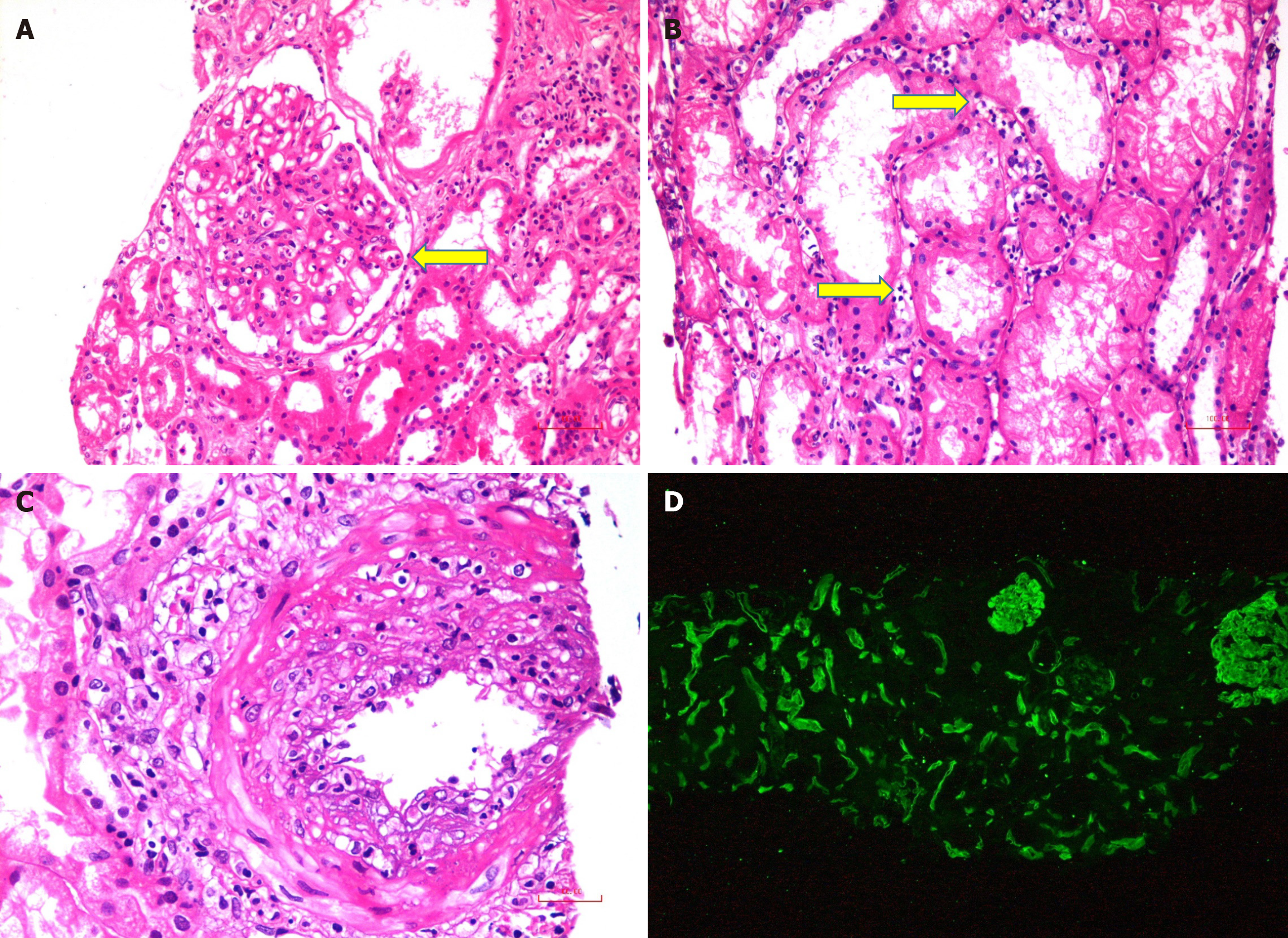 A: Acute glomerulitis. Some of the glomerular capillary lumens are obliterated by inflammatory cell infiltration and/or endothelial cell swelling (arrow). [hematoxylin and eosin (HE), × 400]; B: Foci of mild peritubular capillaritis with up to 4 inflammatory cells in capillary lumens (ptc1) (arrows) (HE, × 400); C: An interlobar sized artery showing transmural arteritis (v3) (HE, × 400); D: Diffuse C4d positivity (C4d) (C4d3) in peritubular capillaries. Glomerular mesangial positivity serves as the internal control (Flourescein isothiocyanate, immunofluorescence for C4d, × 200).
