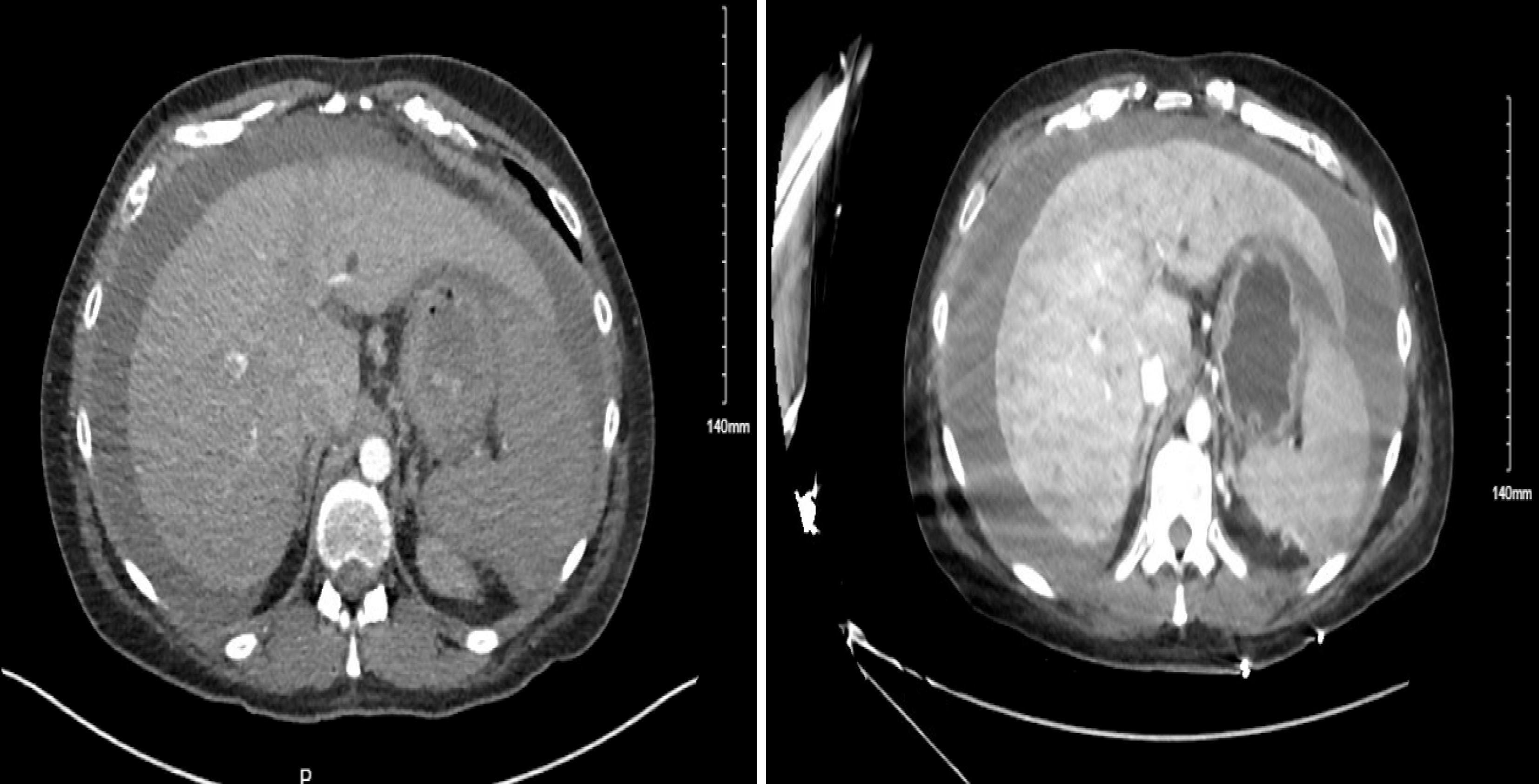 Figure 1 Left image showing initial computed tomography angiography abdomen/pelvis prior to transfer demonstrating hemoperi toneum.