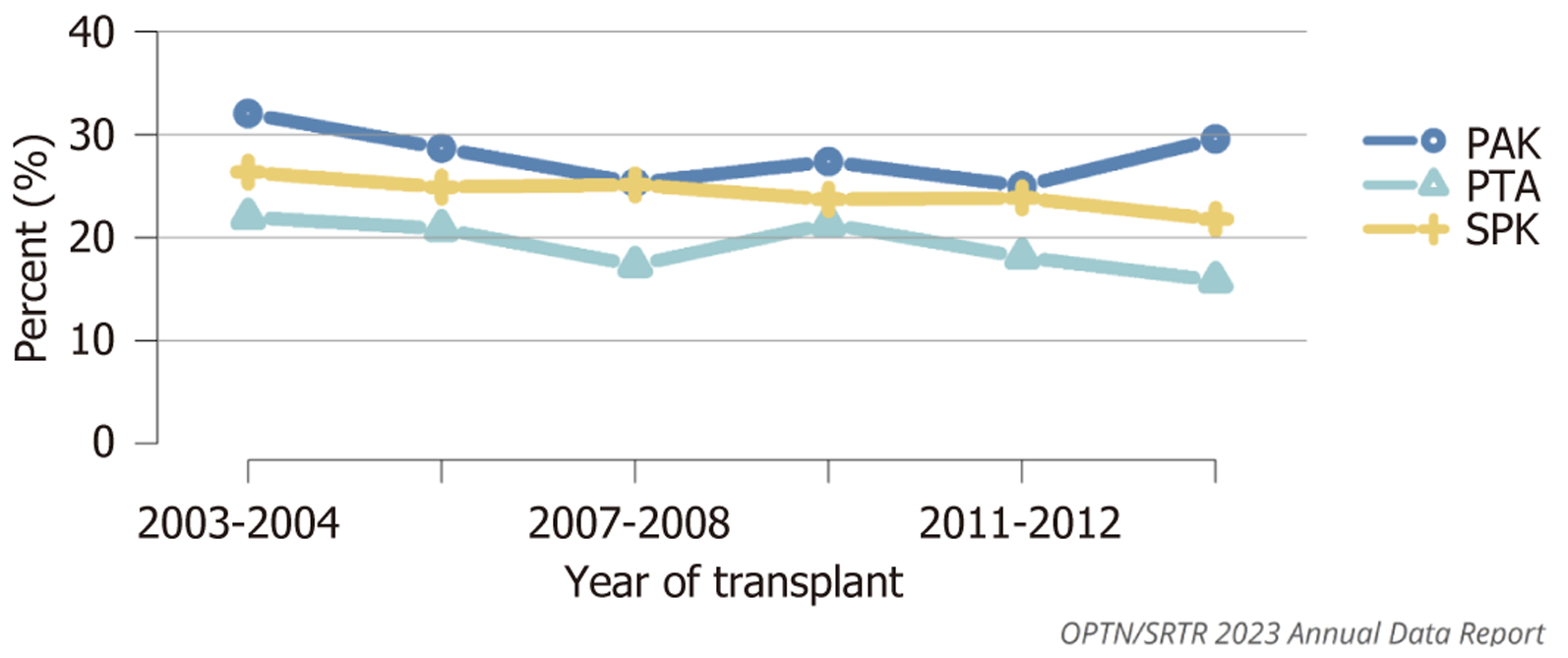 Outcomes are computed using unadjusted Kaplan-Meier methods. Transplant recipients are followed from date of transplant to the earlier of death or 10 years posttransplant. Only first pancreas transplant is considered. PAK reci pients without a record of previous kidney or kidney-pancreas transplant are reclassified as PTA. All time points are 2-year periods. PAK: Pancreas after kidney; PTA: Pancreas transplant alone; SPK: Simultaneous pancreas-kidney. Source: Figure PA70, OPTN/SRTR 2023 Annual Data Report. HHS/HRSA; 2025. Accessed July 28, 2025. https://srtr.transplant.hrsa.gov/annualdatareports.