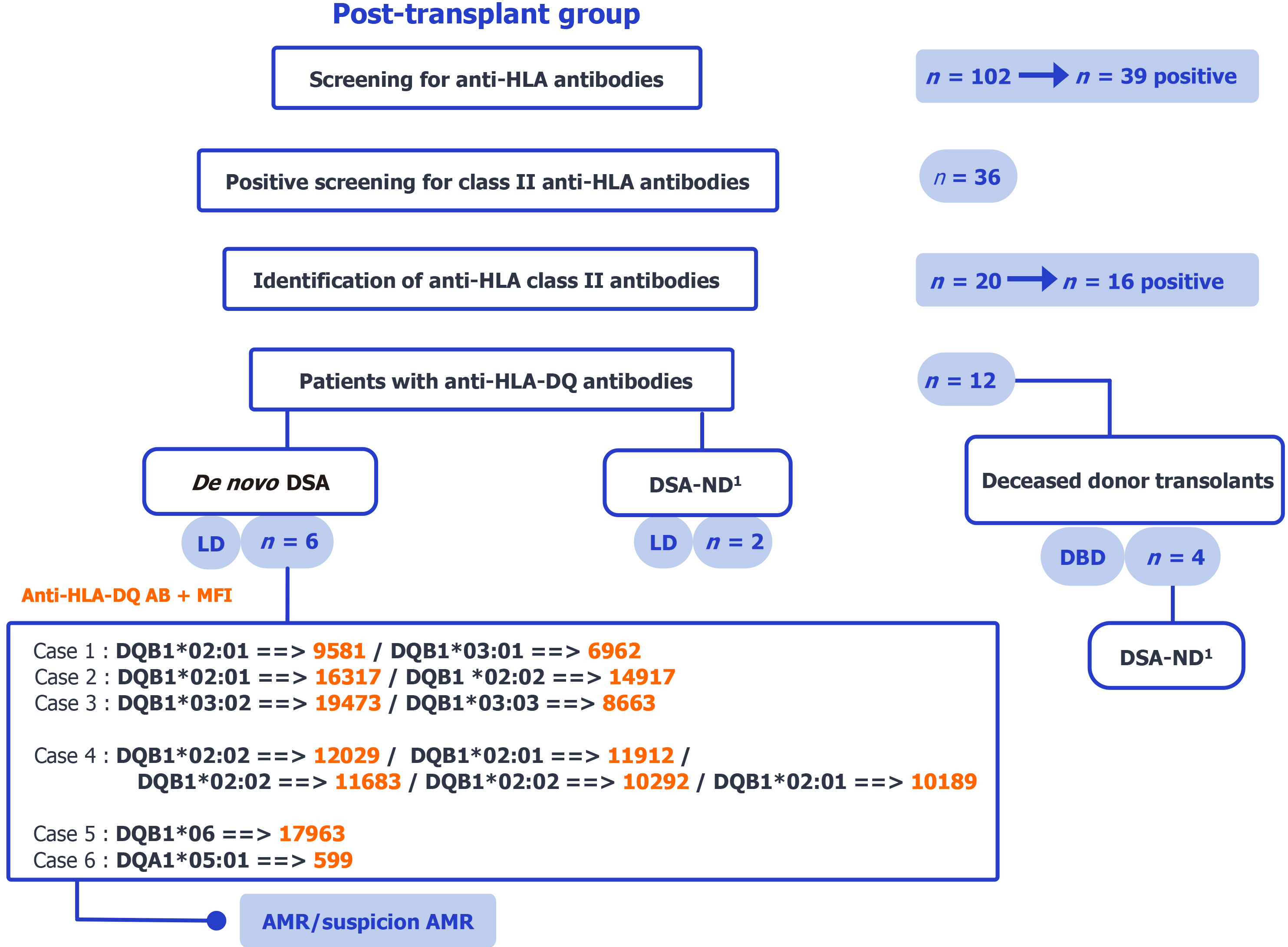 The flowchart illustrates the selection process for post-transplant patients who developed de novo anti-human leukocyte antigen (HLA)-DQ donor-specific antibodies. It shows the classification of these patients according to donor type (living or deceased), the availability of donor HLA-DQ typing, and the immunological profile based on detected donor-specific antibodies specificities and median fluorescence intensity levels. Primary analysis: Confirmed donor HLA-DQ (living donor, n = 6); undetermined reported separately (living donor, n = 2; brain-dead donor, n = 4). 1DSA-ND indicates cases where donor human leukocyte antigen-DQ typing was not performed, preventing confirmation of donor specificity. HLA: Human leukocyte antigen; DSA: Donor-specific antibodies; LD: Living donor; DBD: Brain-dead donor; AB: Antibodies; MFI: Median fluorescence intensity.