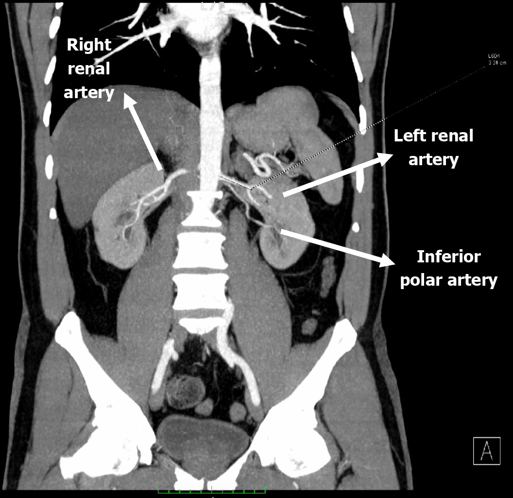 Computed tomography angiography scan depicted the anatomical configuration of the donor renal arteries.