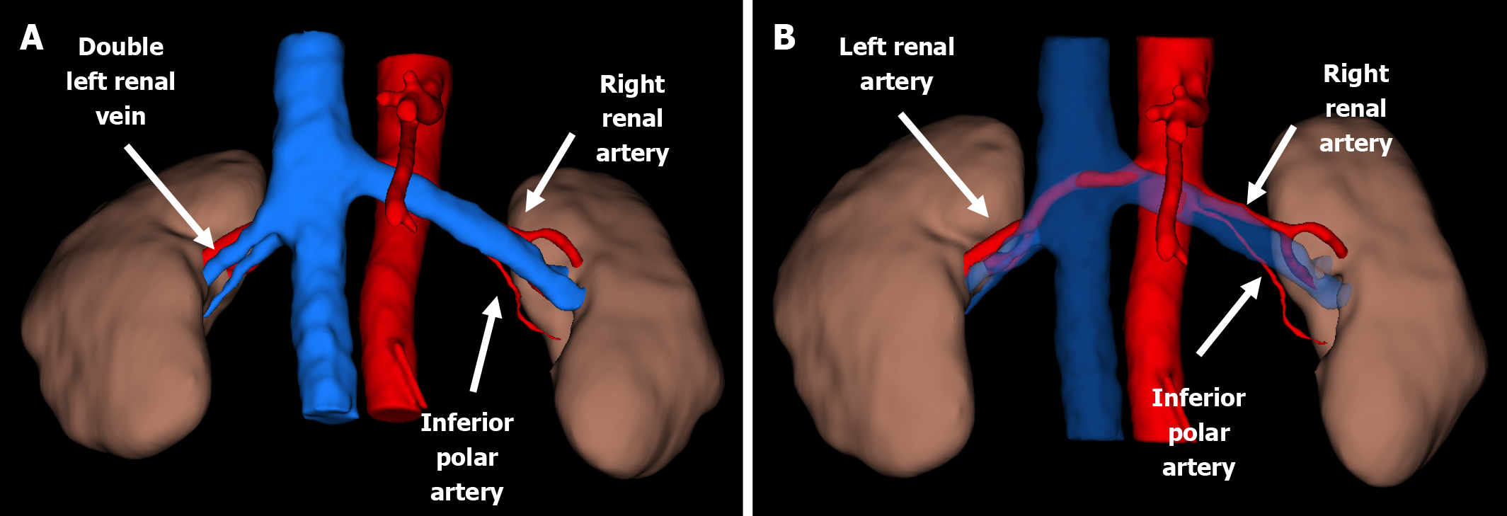 A: Anterior view; B: Anterior view with the left renal vein digitally removed to highlight the left renal arteries.