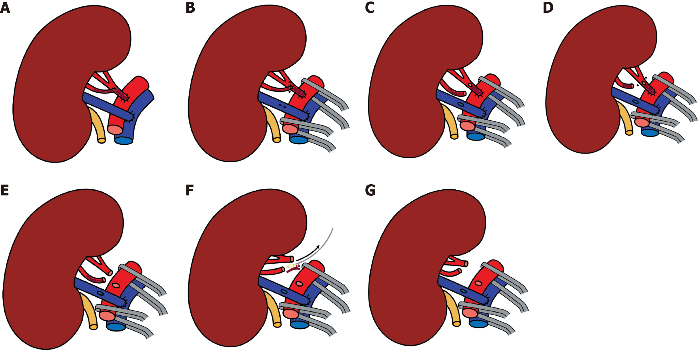A: Thrombosed principal and accessory renal arteries; B-D: Dismantling of the arterial anastomosis; E and F: Thrombectomy of both arteries; G: Renal arteries cleared of thrombus.