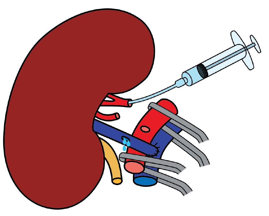 Cold perfusion of the kidney using heparinized saline combined with a vasodilator solution through a venotomy.