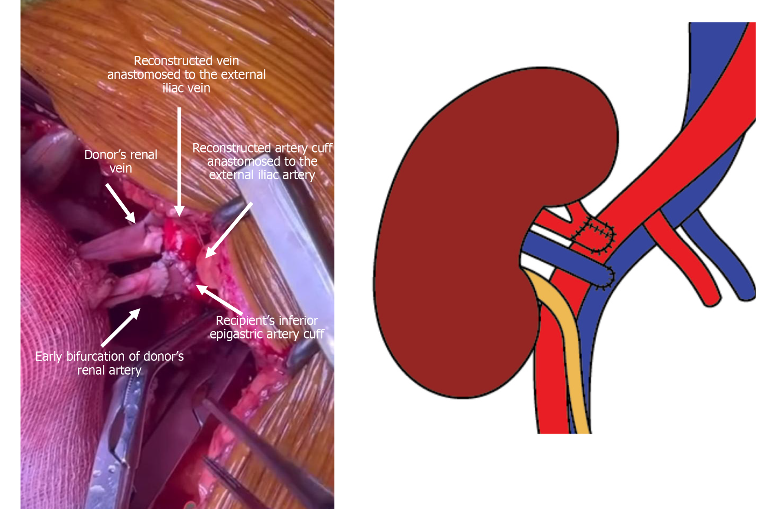 Core Tip: Due to the ongoing shortage of deceased donors, kidney transplantation has increased as a strategy to expand the donor pool. However, this rise has brought increased encounters. We report a successful transplantation involving a kidney with a short renal artery from a living donor, using inferior epigastric artery as a cuff interposition for arterial reconstruction. To our knowledge, this is the first documented case of using epigastric artery in this manner. This novel technique appears to be a promising solution to prevent early thrombosis caused by vessel size discrepancy, and mid- to long-term anastomotic stenosis due to myo-intimal hyperplasia.