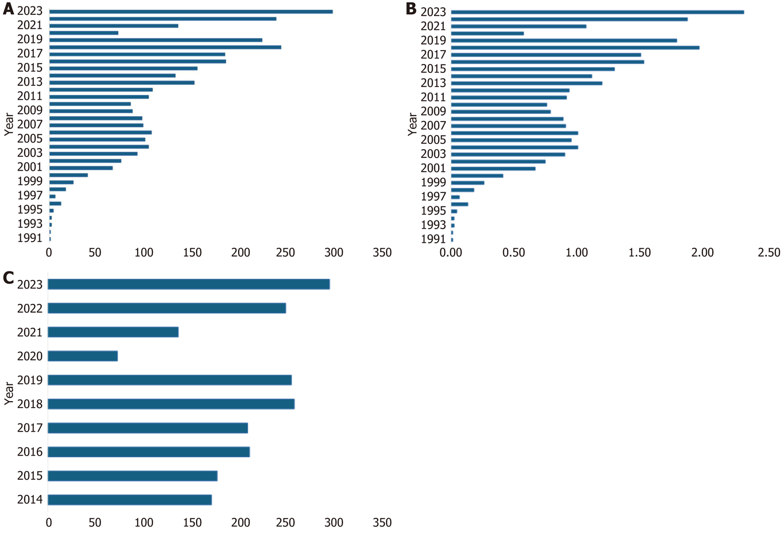 This early success positioned LT as a viable therapeutic option for end-stage liver disease in Mexico[3]. In 1999, the federal government established the National Transplant Center [Centro Nacional de Trasplantes in Spanish (CENATRA)] to oversee and regulate nationwide organ donation and transplantation activities[6]. Over the following decades, the annual number of LTs rose from 25 in 1999 to 297 in 2023, while the national transplant rate increased from 0.01 pmp to 2.3 pmp during the same period (Figure 1A and B). Despite this progress, LT activity in Mexico has plateaued since 2013, and current transplant rates remain among the lowest in Latin America[6].