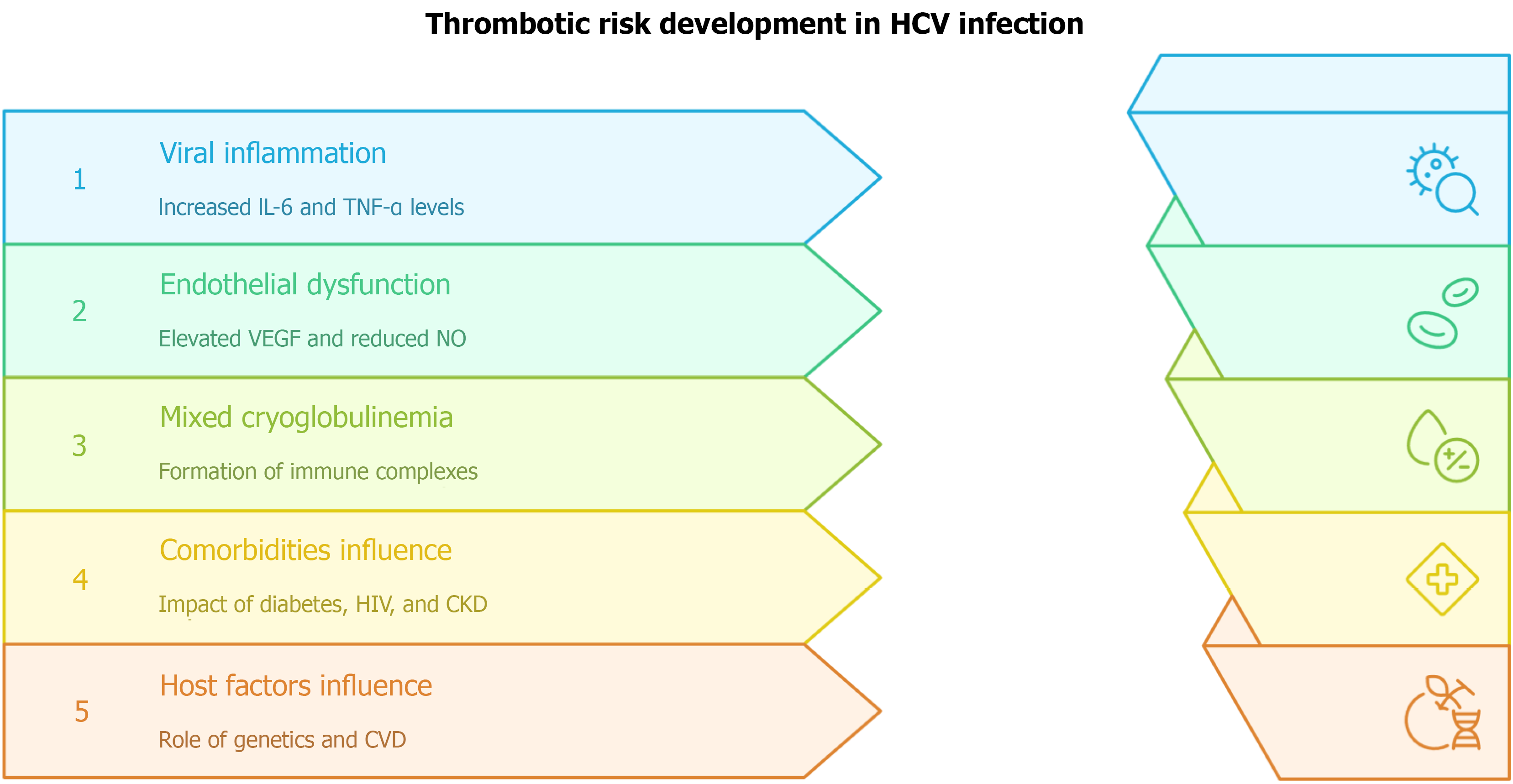 - Citation: Zohery M, Jahangir S, Jenna HC, Sarfraz S, Ali H, Raza M, Rafiq T, Dahiya DS, Jahagirdar V, Ali H. Thrombotic risk in hepatitis C: Interplay between hepatic dysfunction, viral-driven inflammation, and cardiovascular consequences. World J Virol 2025; 14(4): 113217