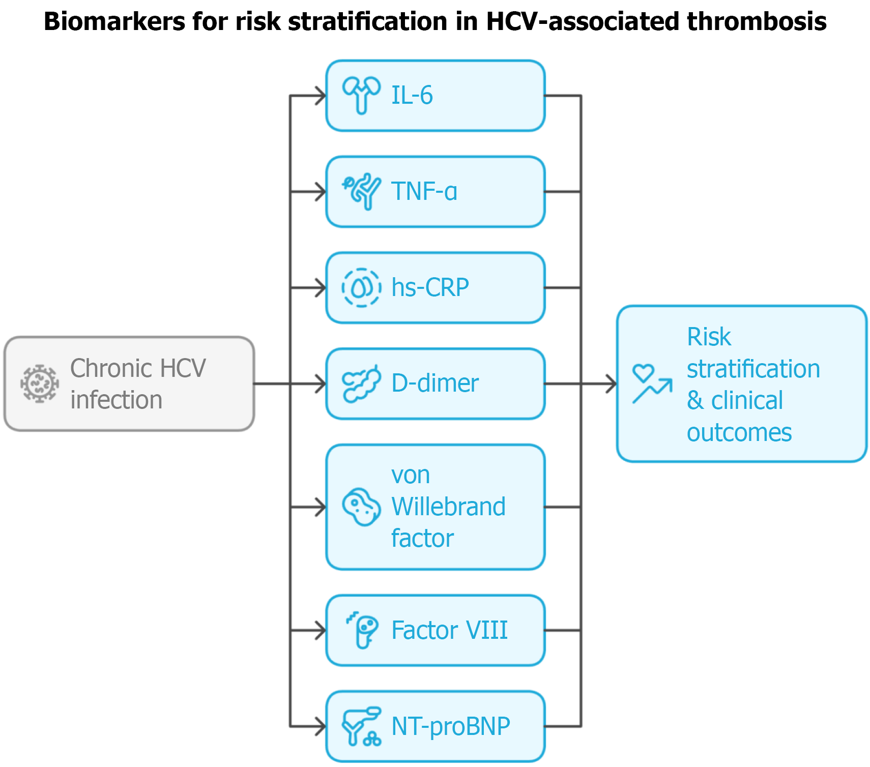 Candidate biomarkers - including interleukin-6, tumor necrosis factor-α, high-sensitivity C-reactive protein, D-dimer, von Willebrand factor, N-terminal pro-B-type natriuretic peptide, and factor VIII - may provide prognostic value for assessing cardiovascular and thrombotic risk in patients with chronic hepatitis C virus infection. HCV: Hepatitis C virus; IL-6: Interleukin-6; TNF-α: Tumor necrosis factor-α; hs-CRP: High-sensitivity C-reactive protein; NT-proBNP: N-terminal pro B-type natriuretic peptid.