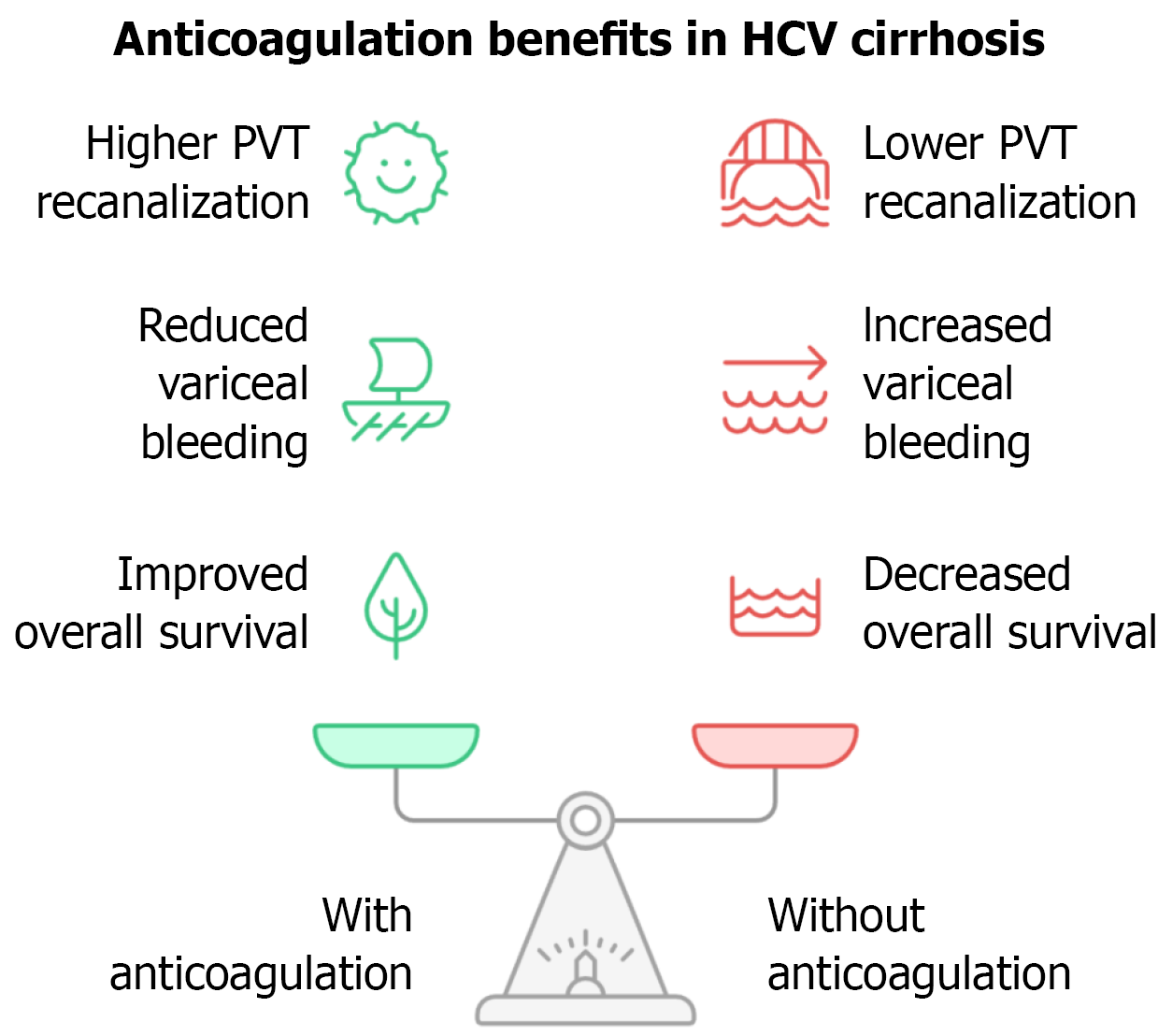 Anticoagulation in patients with hepatitis C virus-related cirrhosis may reduce portal vein thrombosis, limit hepatic decompensation, and improve survival. HCV: Hepatitis C virus; PVT: Portal vein thrombosis.