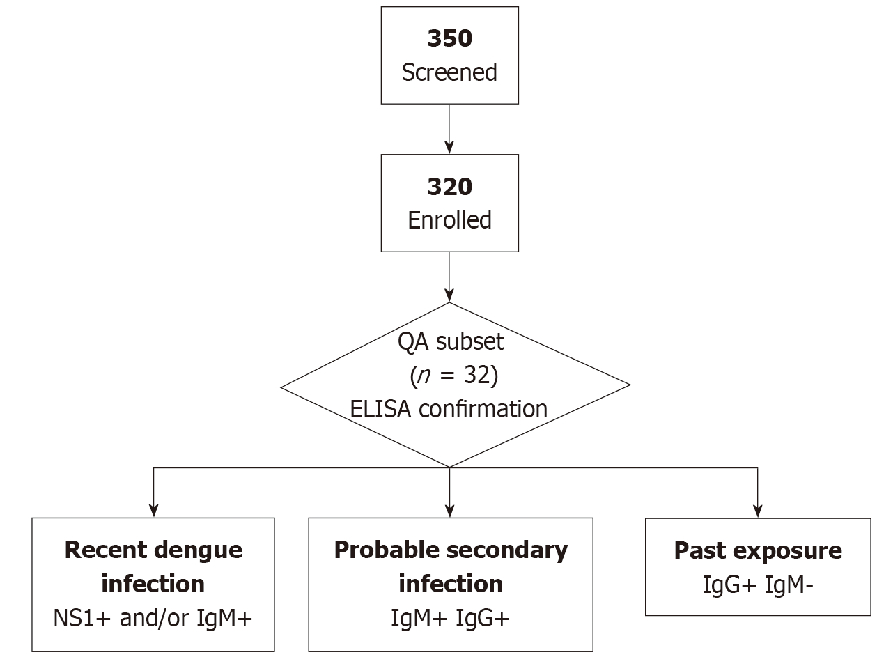 The remaining 320 eligible patients were enrolled and underwent NS1/IgM/IgG testing. A quality-assurance subset (n = 32) underwent enzyme-linked immunosorbent assay confirmation. ELISA: Enzyme-linked immunosorbent assay; QA: Quality assurance.