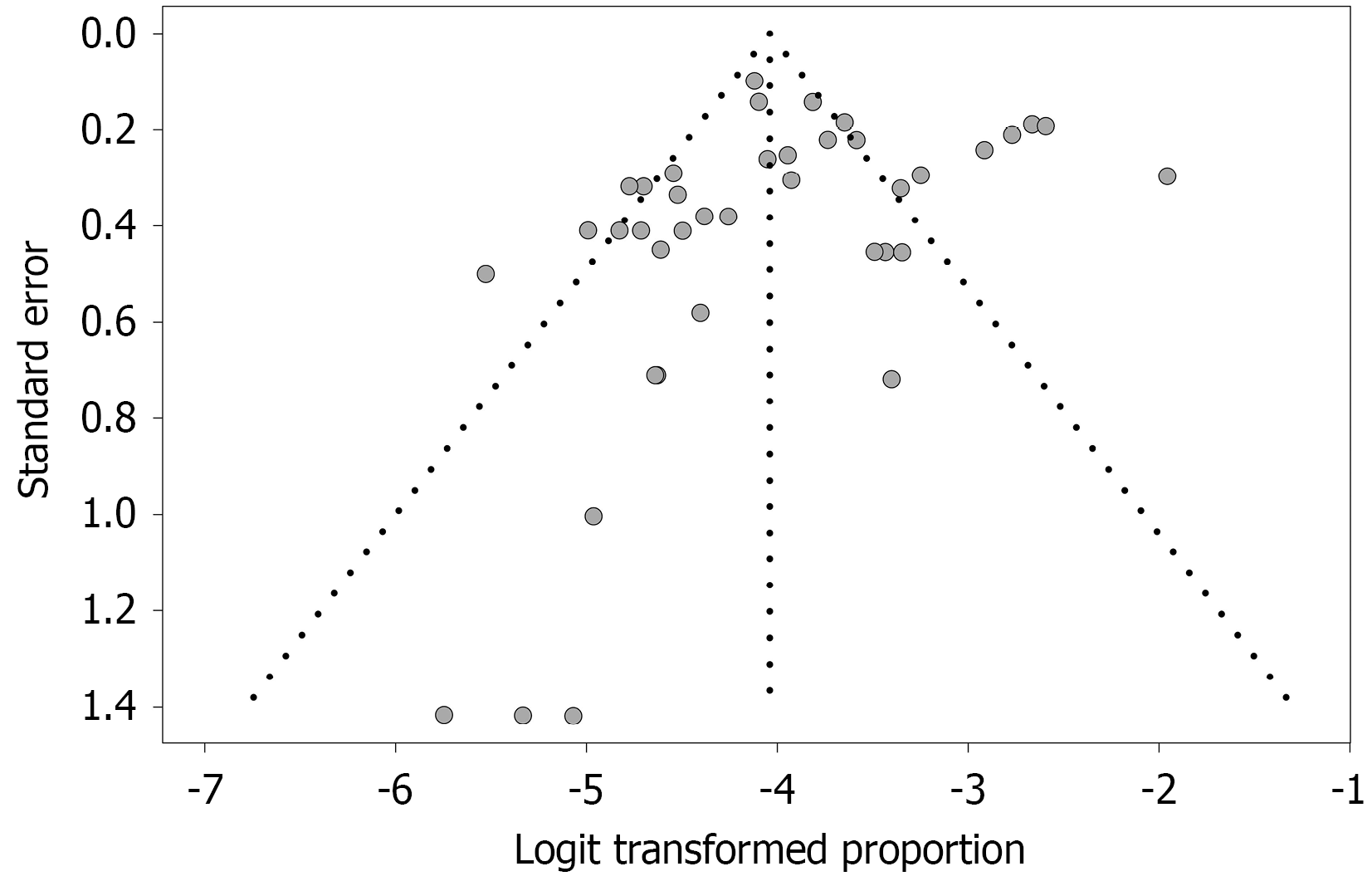 Figure 3 Funnel plot with transformed prevalence on the X-axis and standard error of transformed proportions on the Y-axis.