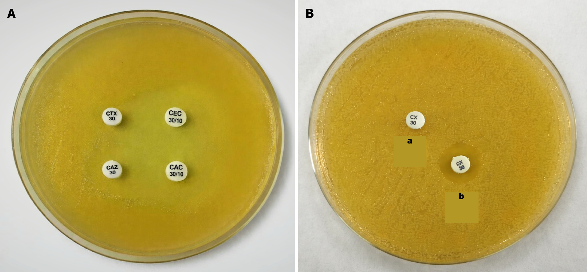 A: Extended-spectrum beta-lactamases detection by combined disc diffusion test; B: Detection of AmpC by boric acid and ethylenediamine tetraacetic acid (a: Cefoxitin, b: Cefoxitin with boric acid and ethylenediamine tetraacetic acid). CTX: Cefotaxime; CEC: Cefotaxime + clavulanic acid; CAZ: Ceftazidime; CAC: Ceftazidime + clavulanic acid; CX: Cefoxitin.
