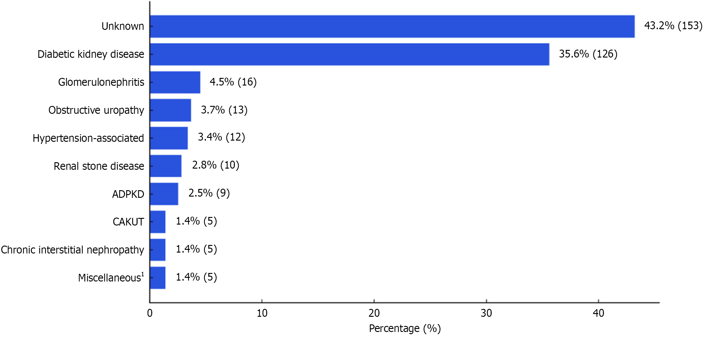 1Miscellaneous included renal artery stenosis (n = 2), chronic pyelonephritis (n = 2), and medullary sponge kidney (n = 1). ADPKD: Autosomal dominant polycystic kidney disease; CAKUT: Congenital anomalies of the kidneys and urinary tracts.
