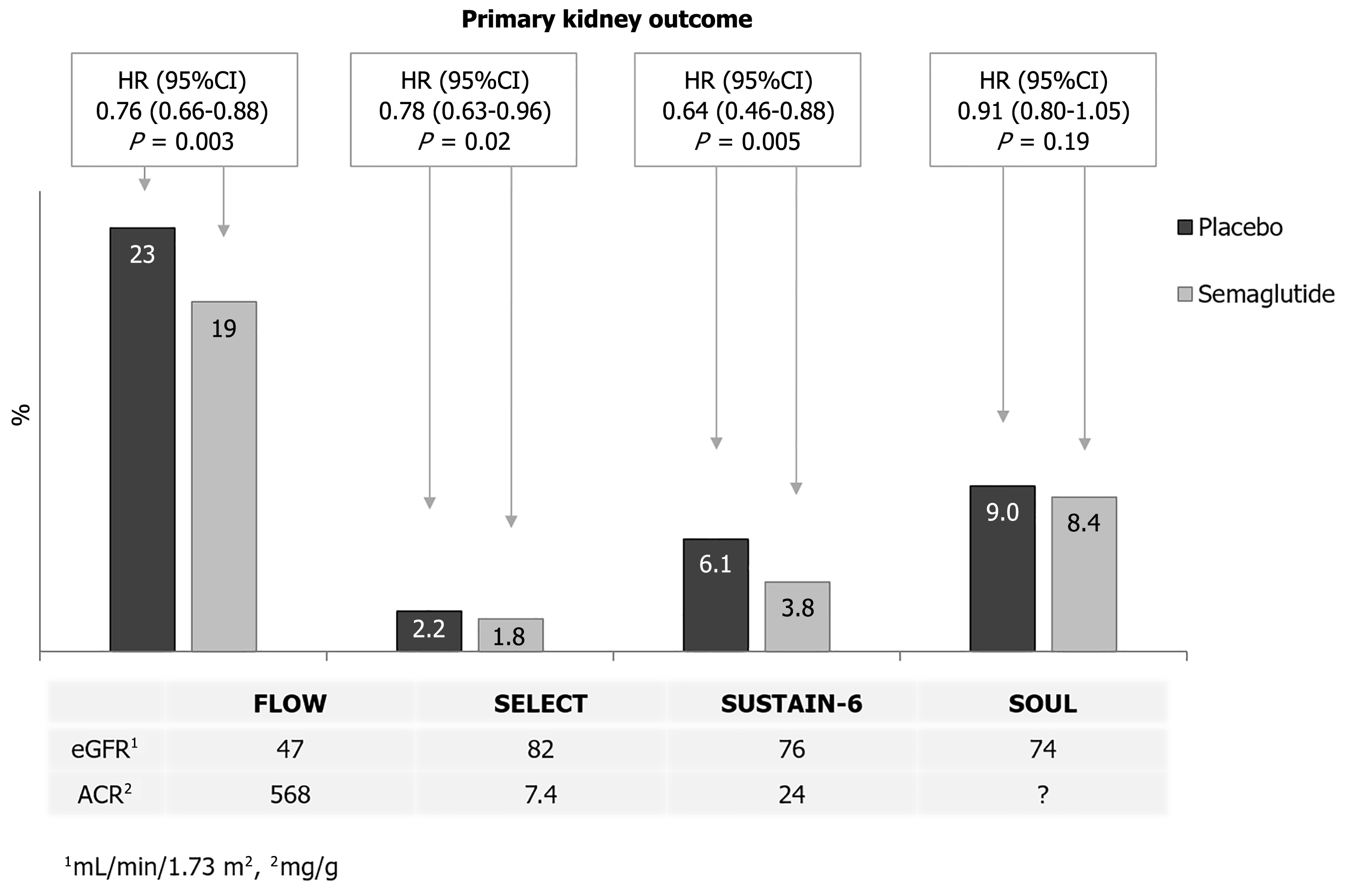 FLOW: Evaluate Renal Function with Semaglutide Once Weekly. Primary kidney Outcome- New or worsening nephropathy: Macroalbuminuria, doubling of serum creatinine with estimated glomerular filtration rate (eGFR) ≤ 45, initiation of renal replacement, or renal death. SELECT: Semaglutide Effects on Cardiovascular Outcomes in People with Overweight or Obesity. Primary Kidney Outcome- Composite: ≥ 50% decline in eGFR, kidney failure, or kidney-related death. SUSTAIN-6: Semaglutide Use to Stabilize and Improve Glycemic Control in Individuals with Type 2 Diabetes. Primary Kidney Outcome- New or worsening nephropathy: Macroalbuminuria, doubling of serum creatinine with eGFR ≤ 45, initiation of renal replacement, or renal death. SOUL: Semaglutide Cardiovascular Outcomes Trial. Primary Kidney Outcome- Includes: Cardiovascular death, kidney death, ≥ 50% eGFR decline, sustained eGFR < 15, or initiation of dialysis/transplant. eGFR: Estimated glomerular filtration rate; ACR: Albumin to creatine ratio.