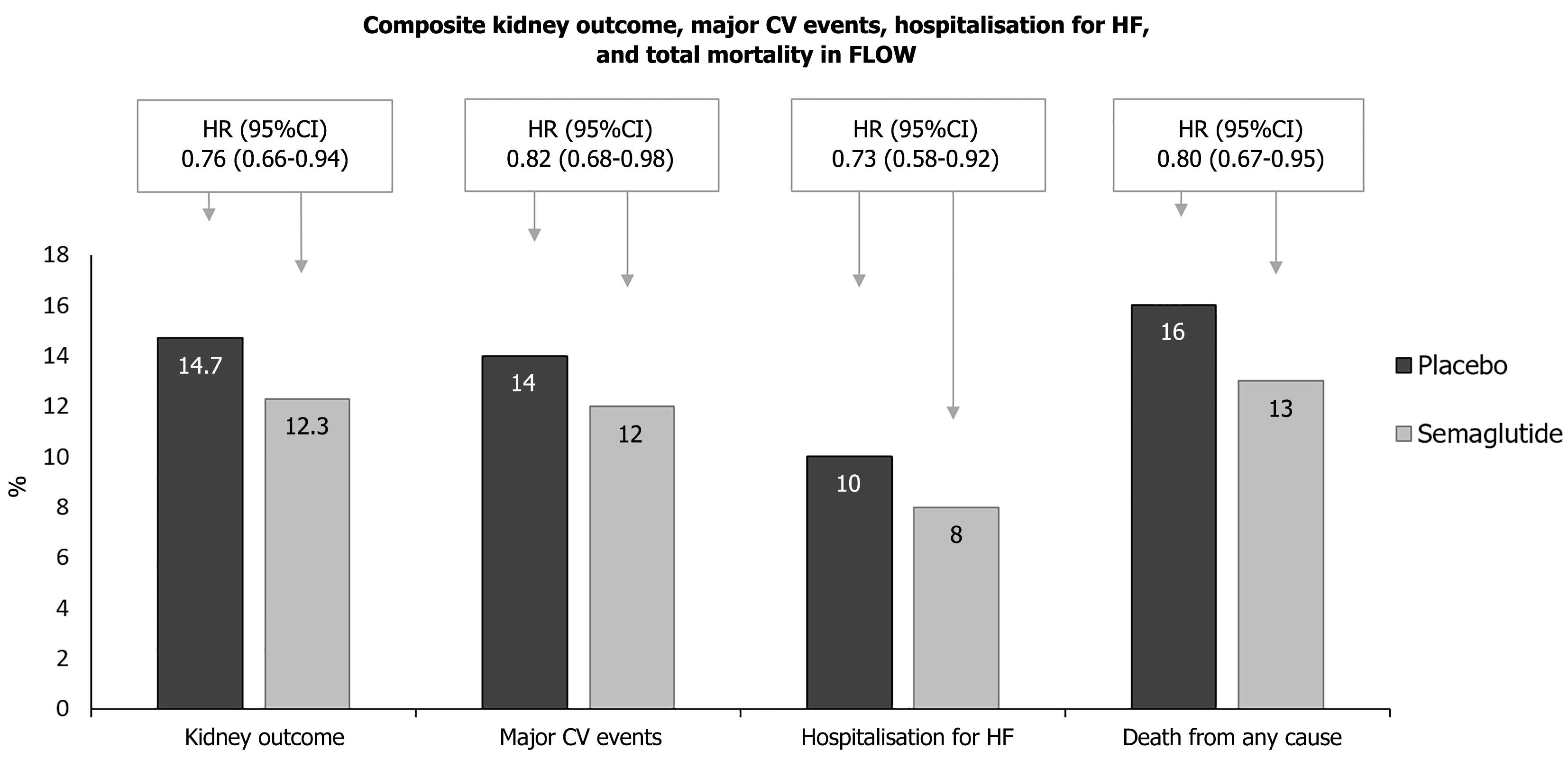 Evaluate Renal Function with Semaglutide Once Weekly kidney outcome- New or worsening nephropathy: Macroalbuminuria, doubling of serum creatinine with estimated glomerular filtration rate (eGFR ≤ 45), initiation of renal replacement, or renal death. Major CV events: Major CV events including CV death, non-fatal myocardial infarction, or non-fatal stroke and heart failure with secondary/exploratory outcomes included hospitalization for heart failure; CV: Cardiovascular; HF: Heart failure; FLOW: Evaluate Renal Function with Semaglutide Once Weekly.