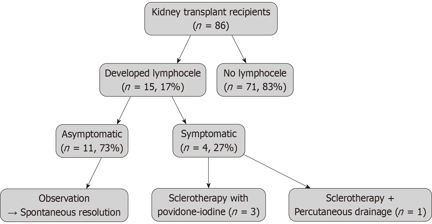 Flowchart showing the management and outcomes of lymphocele cases after kidney transplantation.