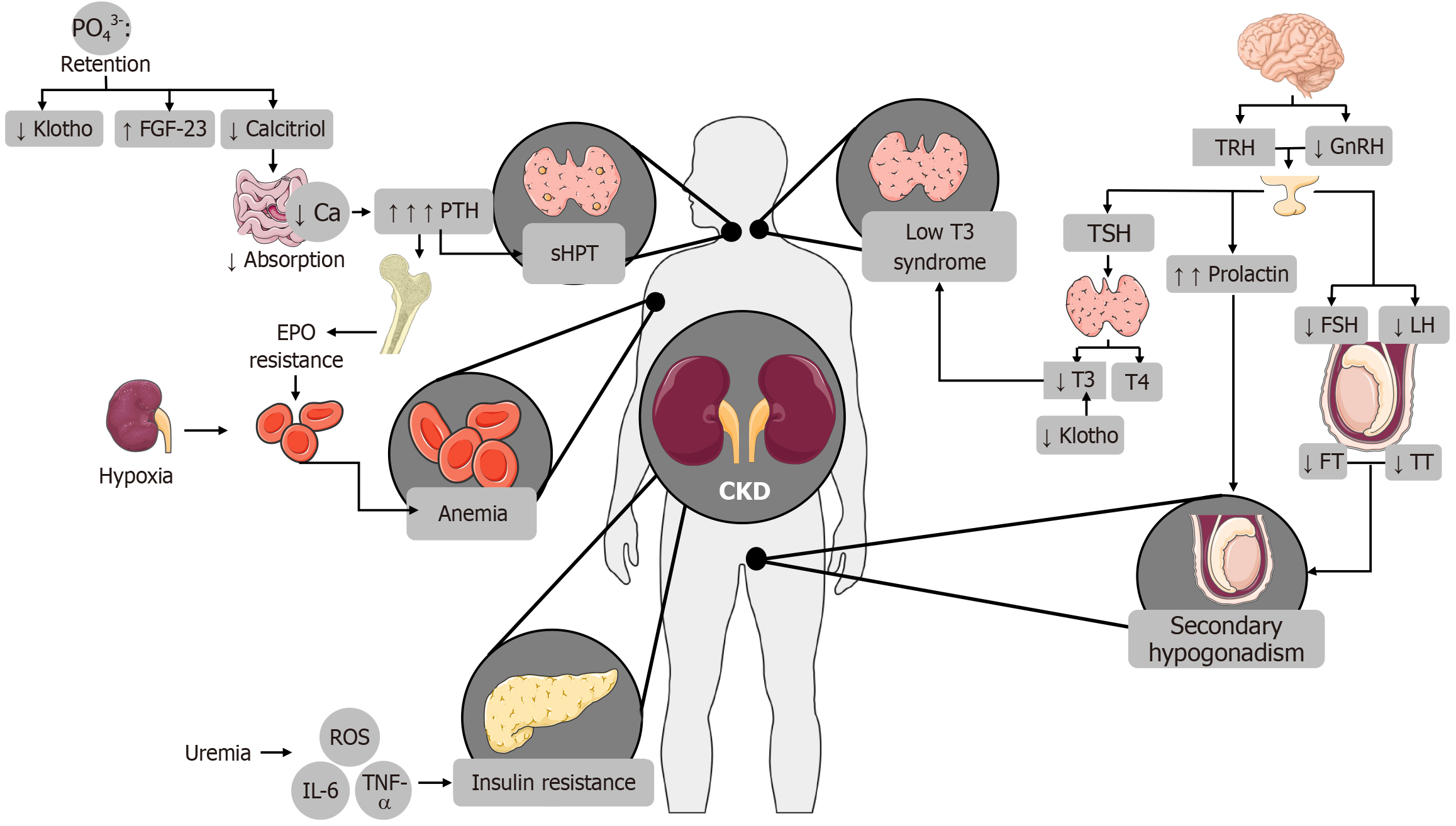 Overview of the mechanisms underlying the main endocrine pathways affected in chronic kidney disease. CKD: Chronic kidney disease; PO43-: Phosphate; FGF-23: Fibroblast growth factor 23; PTH: Parathyroid hormone; sHPT: Secondary hyper parathyroidism; EPO: Erythropoietin; ROS: Reactive oxygen species; IL-6: Interleukin 6; TNF-α: Tumor necrosis factor alpha; Ca: Calcium; TSH: Thyroid-stimulating hormone; TRH: Thyrotropin-releasing hormone; T3: Triiodothyronine; T4: Thyroxine; GnRH: Gonadotropin-releasing hormone; FSH: Follicle-stimulating hormone; LH: Luteinizing hormone; TT: Total testosterone; FT: Free testosterone.
