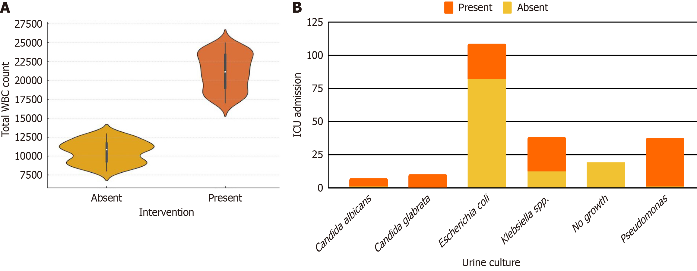 A: Violin plot comparing total white blood cell count in patients with and without intervention; B: Distribution of intensive care unit admissions stratified by urine culture organisms. WBC: White blood cell; ICU: Intensive care unit.