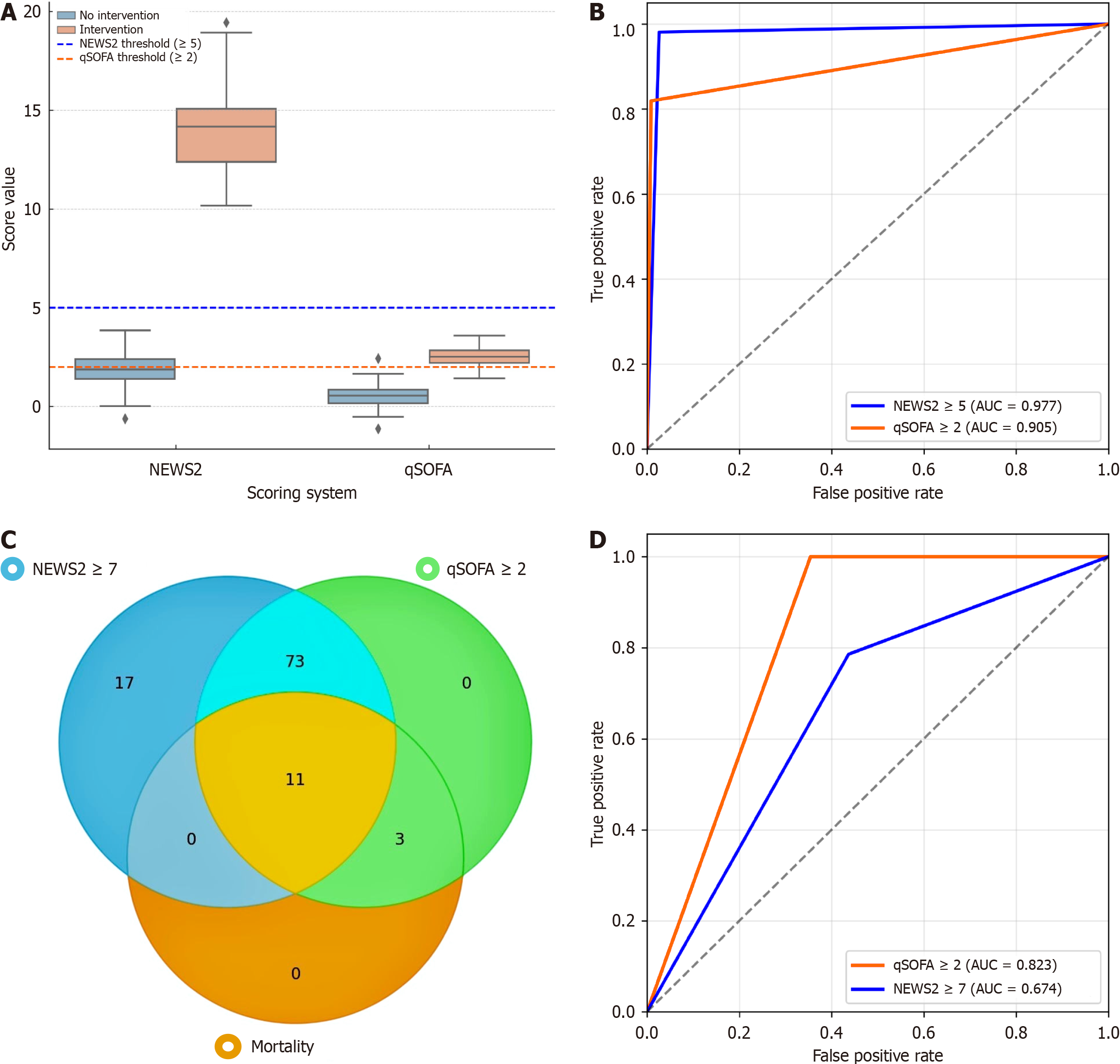 A: Box plot demonstrating that National Early Warning Score 2 (NEWS2) score showing a broader distribution among the intervention group; B: Receiver operating characteristic (ROC) curves for NEWS2 and quick Sequential Organ Failure Assessment score (qSOFA) in predicting intensive care unit admission; C: Venn diagram shows the distribution of high-risk patients (NEWS2 score ≥ 7 and qSOFA score ≥ 2); D: ROC curves for predicting in-hospital mortality. NEWS2: National Early Warning Score 2; qSOFA: Quick Sequential Organ Failure Assessment score; AUC: Area under the receiver operating characteristic.