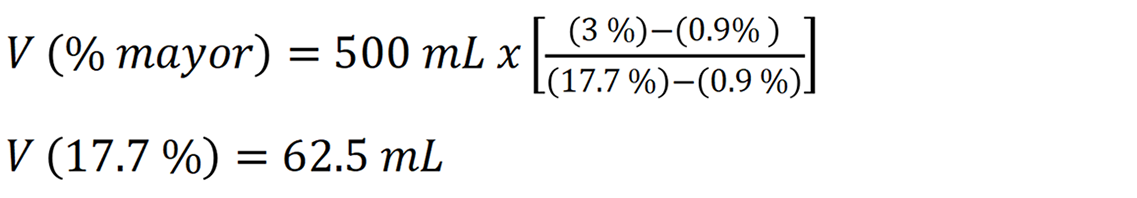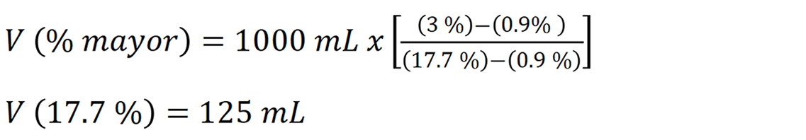 125 mL of 17.7% NaCl should be mixed with 875 mL of 0.9% sodium saline normal. Since commercial presentations of 17.7% NaCl in Mexico typically come in 10 mL ampoules, this equates to 12.5 ampoules. It is important to note that the calculated volume of concentrated solution must be removed from the total volume of the base solution (gauged) to maintain the desired final concentration.