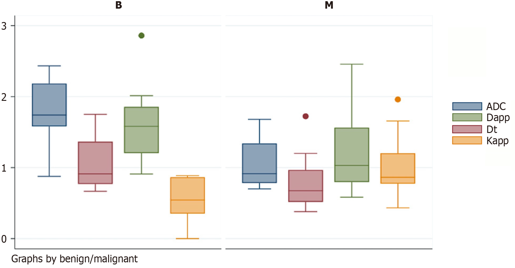 ADC: Apparent diffusion coefficient; Dapp: Diffusion coefficient; Dt: True Diffusion coefficient; Kapp: Kurtosis coefficient; B: Benign; M: Malignant.
