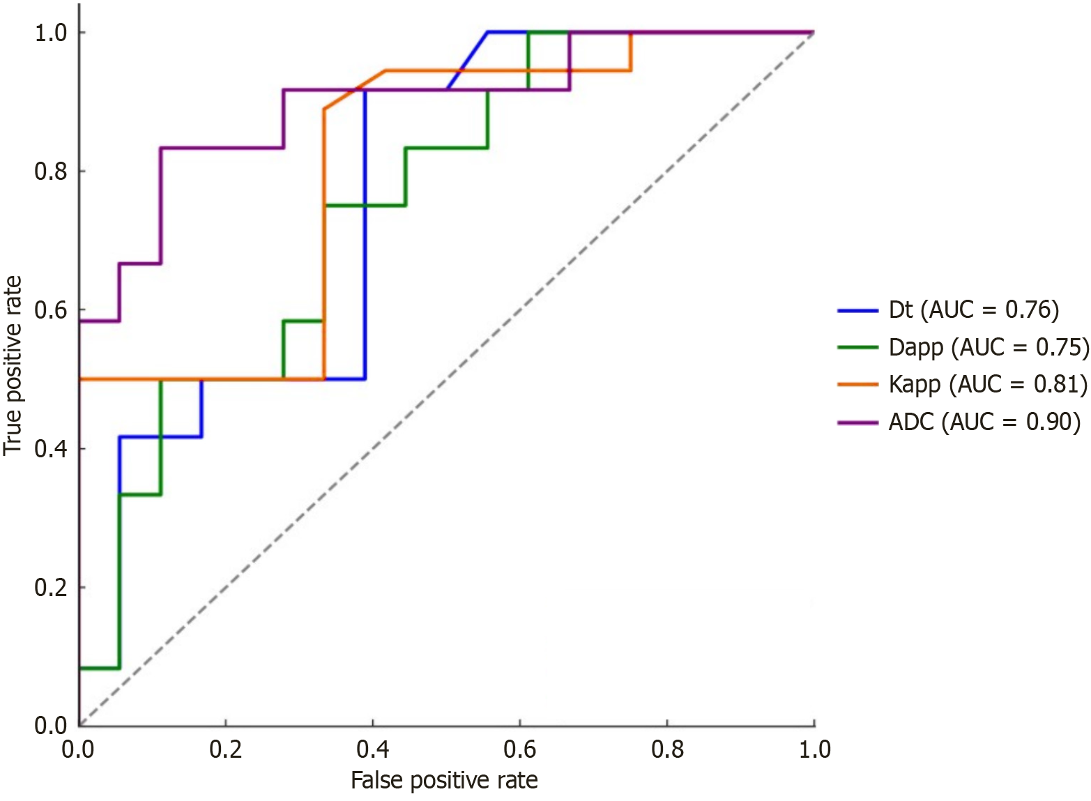 ADC: Apparent diffusion coefficient; Dapp: Apparent diffusion coefficient derived from diffusion kurtosis imaging; Dt: Diffusion coefficient; Kapp: Apparent kurtosis coefficient.