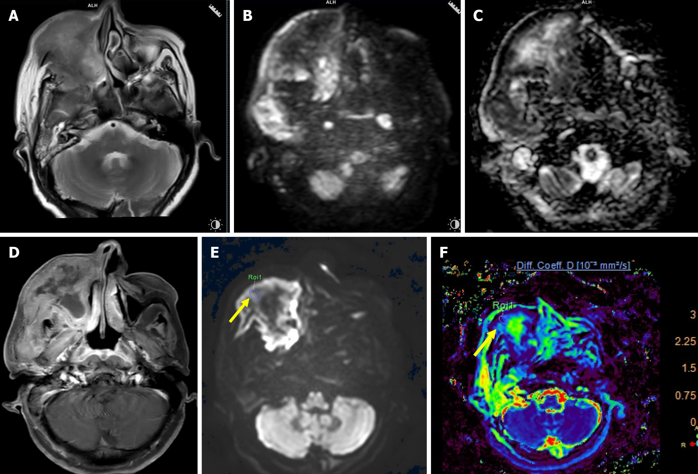 A: Axial T2-weighted image (T2WI) shows an ill-defined intermediate signal intensity mass epicentered in the right maxillary sinus with infiltration of the subcutaneous plane and skin; B: High b-value (b = 1000 seconds/mm2) image shows areas of high signal intensity; C: On corresponding apparent diffusion coefficient (ADC) map, similar areas showed hypointensity suggestive of true diffusion restriction (mean ADC value of 0.77 × 10-3 mm2/second); D: Axial post contrast T1WI image shows heterogeneous enhancement with central nonenhancing areas; E: High b-value image (b = 2000 seconds/mm2) of intravoxel incoherent motion imaging/diffusion kurtosis imaging sequence with region of interest (ROI) drawn (arrow) over the mass; F: True diffusion coefficient map after drawing ROI showed low value (0.68 × 10-3 mm2/second).