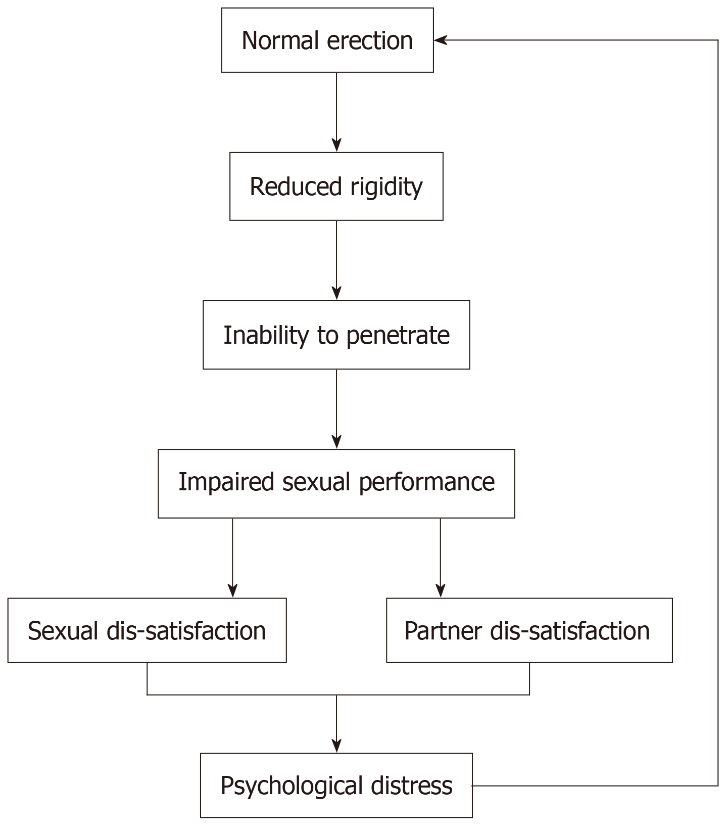Figure 3 Impaired sexual performance, sexual satisfaction, and psychological distress develop as a consequence of erectile dysfunction, which can subsequently increase the severity of erectile dysfunction.