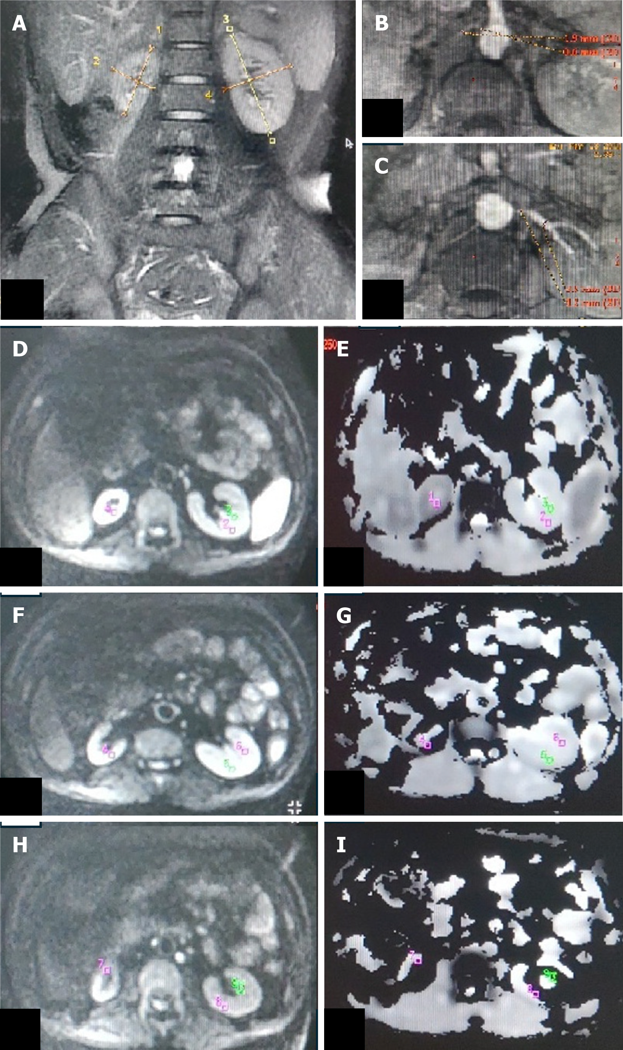 A: T2W magnetic resonance (MR) image (coronal plane) showing atrophic right kidney (6.1 cm) and normal-sized left kidney (9.0 cm); B and C: Non-contrast MR angiography (INHANCE) in axial plane depicting diffuse stenosis of the right renal artery (B) and severe stenosis of the left renal artery at the ostium (C); D-I: Diffusion-weighted MR imaging (DW-MRI) image (D, F, H) in the axial plane with corresponding ADC map (E, G, I) of bilateral kidneys showing manually drawn region-of-interest (ROI) placed in the upper (D, E), middle (F, G) and lower (H, I) pole regions of the bilateral kidney. On the right side, as the kidney is atrophic, the ROI was placed in the corticomedullary region, whereas on the left, the ROI was placed separately in the cortex and medulla. Mean corticomedullary ADC of the right kidney was 1.19 × 10-3 mm2/s. Mean cortical ADC and medullary ADC values of the left kidney were 169 × 10-3 mm2/s and 1.76 × 10-3 mm2/s, respectively.