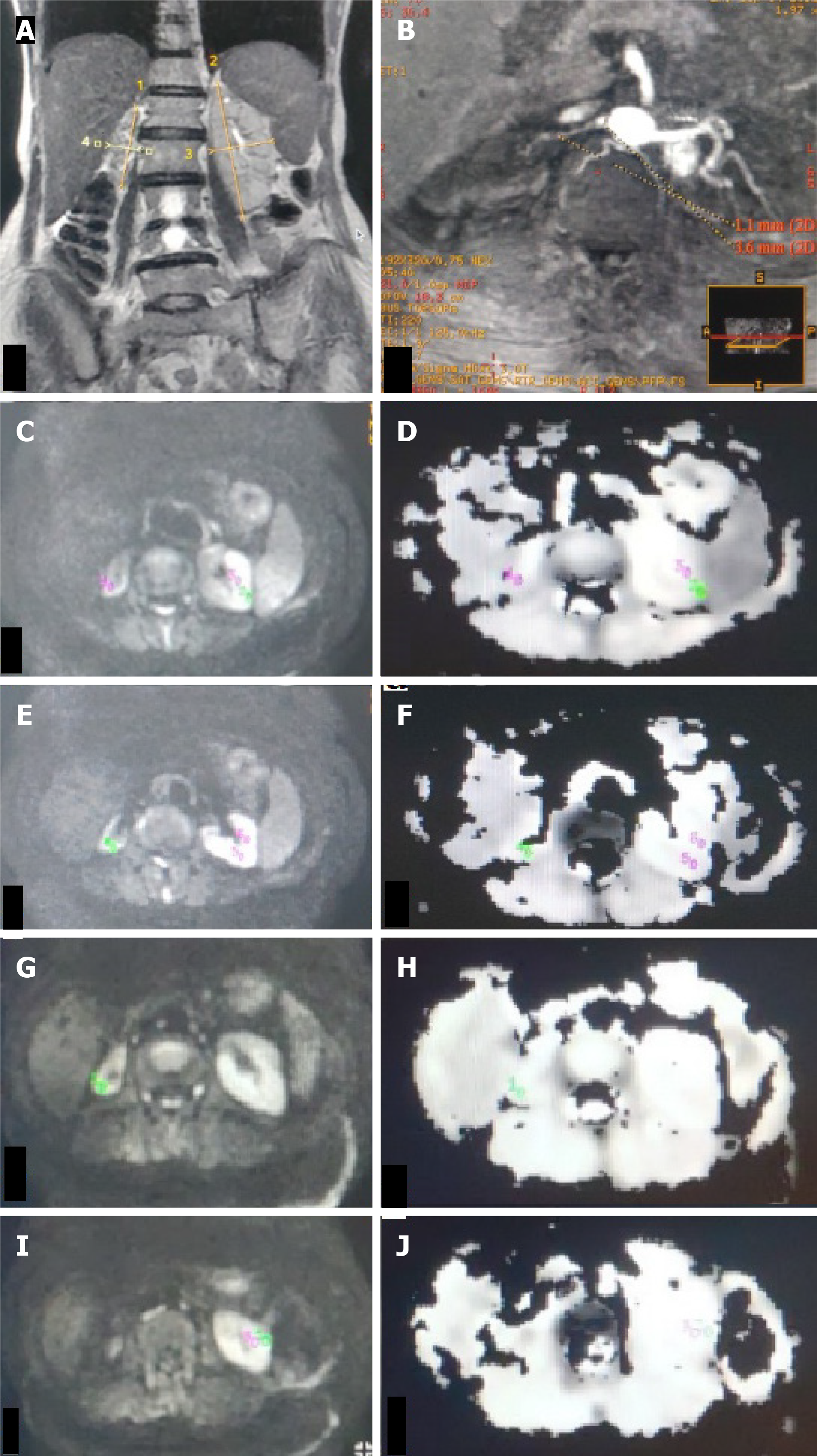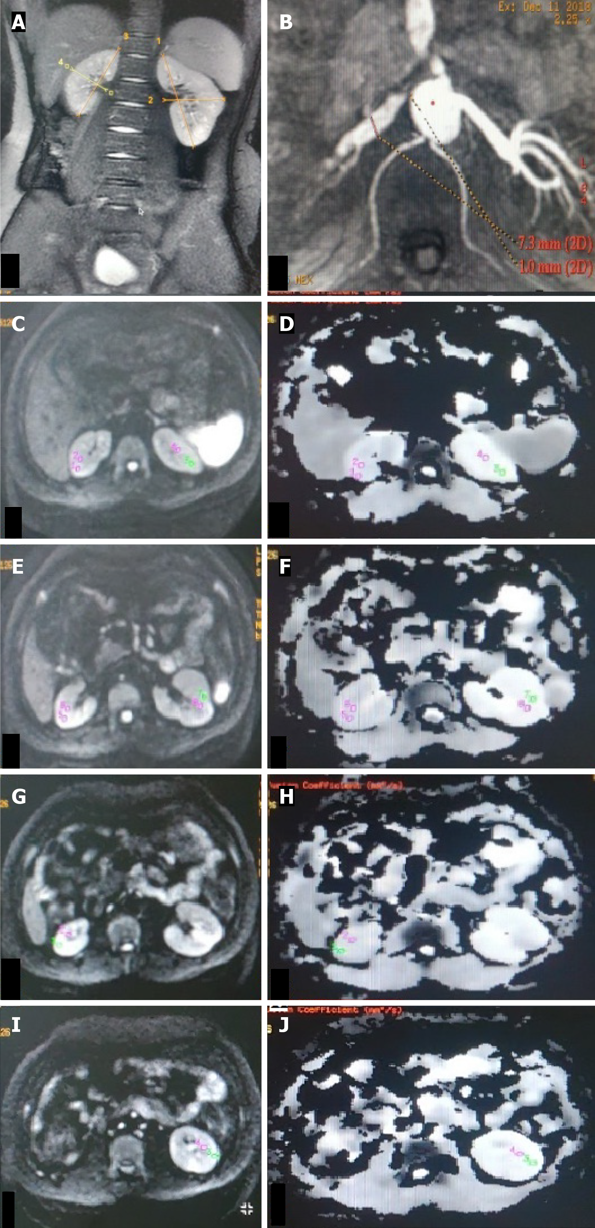 A: T2W magnetic resonance image (MRI) (coronal plane) showing atrophic right kidney (4 cm) and normal-sized left kidney (9.4 cm); B: Non-contrast MR angiography (INHANCE) in axial plane depicting diffuse stenosis of right renal artery; C-J: DW MRI image (C, E, G, I) in the axial plane with corresponding apparent diffusion coefficient (ADC) map (D, F, H, J) of bilateral kidneys showing manually drawn region-of-interest (ROI) placed in the upper (C, D), middle (E, F) pole of bilateral kidneys, lower (G, H) pole region of right kidney and lower (I, J) pole region of left kidney. On the right side, as the kidney is atrophic, the ROI was placed in the corticomedullary region, whereas on the left, the ROI was placed separately in the cortex and medulla. Mean corticomedullary ADC of the right kidney was 1.43 × 10-3 mm2/s. Mean cortical ADC and medullary ADC values of the left kidney were 194 × 10-3 mm2/s and 1.91 × 10-3 mm2/s, respectively.