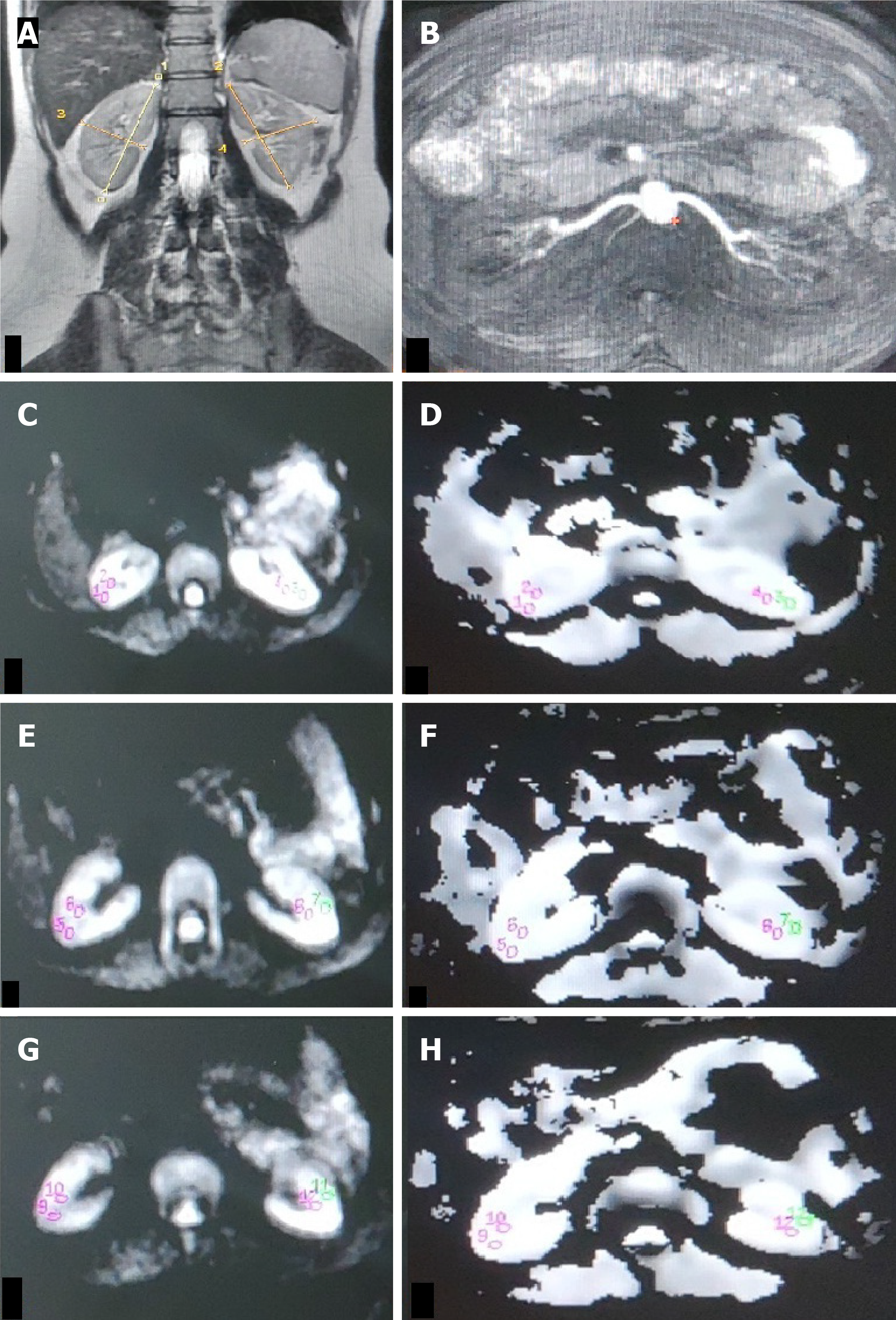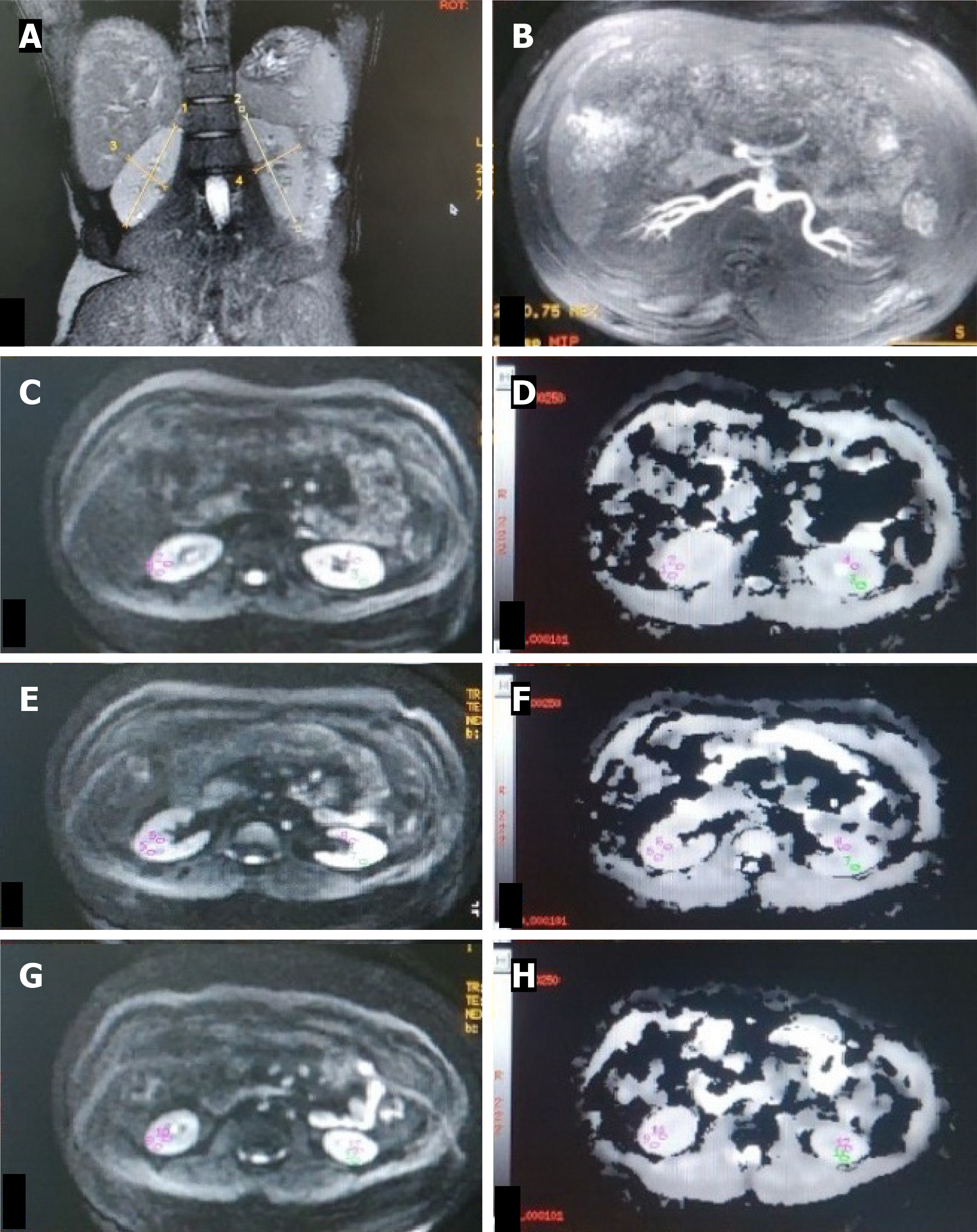 A: T2W magnetic resonance (MR) image (coronal plane) showing bilateral normal-sized kidneys (RK 8.9 cm, LK 8.9 cm); B: Non-contrast MR angiography (INHANCE) depicting bilateral normal renal arteries in the axial plane; C-H: Diffusion-weighted MR image (C, E, G) in the axial plane with corresponding apparent diffusion coefficient (ADC) map (D, F, H) of bilateral kidneys showing manually drawn region-of-interest (ROI) placed in the upper (C, D), middle (E, F) and lower (G, H) pole regions of bilateral kidneys. The ROI is placed in the cortex and medulla on both sides. Mean cortical ADC and medullary ADC values of the right kidney were 191 × 10-3 mm2/s and 1.86 × 10-3 mm2/s. Mean cortical ADC and medullary ADC values of the left kidney were 189 × 10-3 mm2/s and 1.82 × 10-3 mm2/s, respectively.