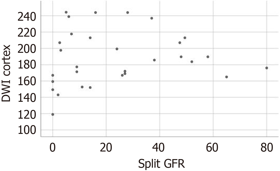 Figure 7 Scatter plot representing the relationship between renal apparent diffusion coefficient values (× 10-3 mm2/s) and the split GFR (mL/minute).