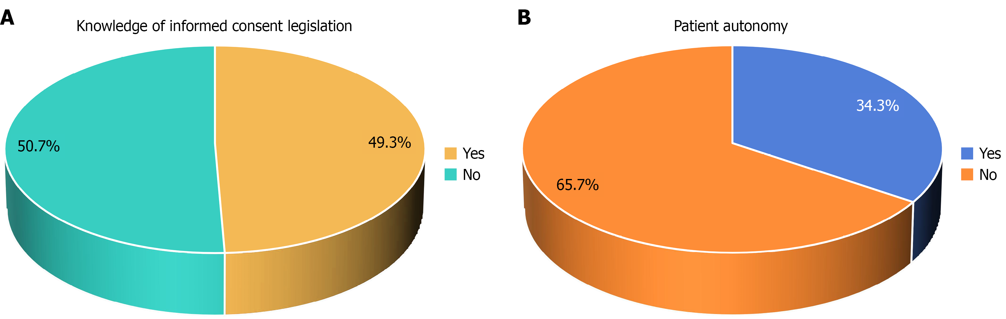 A: Permitting patients to decide if endoscopy can be viewed as a learning activity; B: Awareness of legislation concerning informed consent in Nigeria.