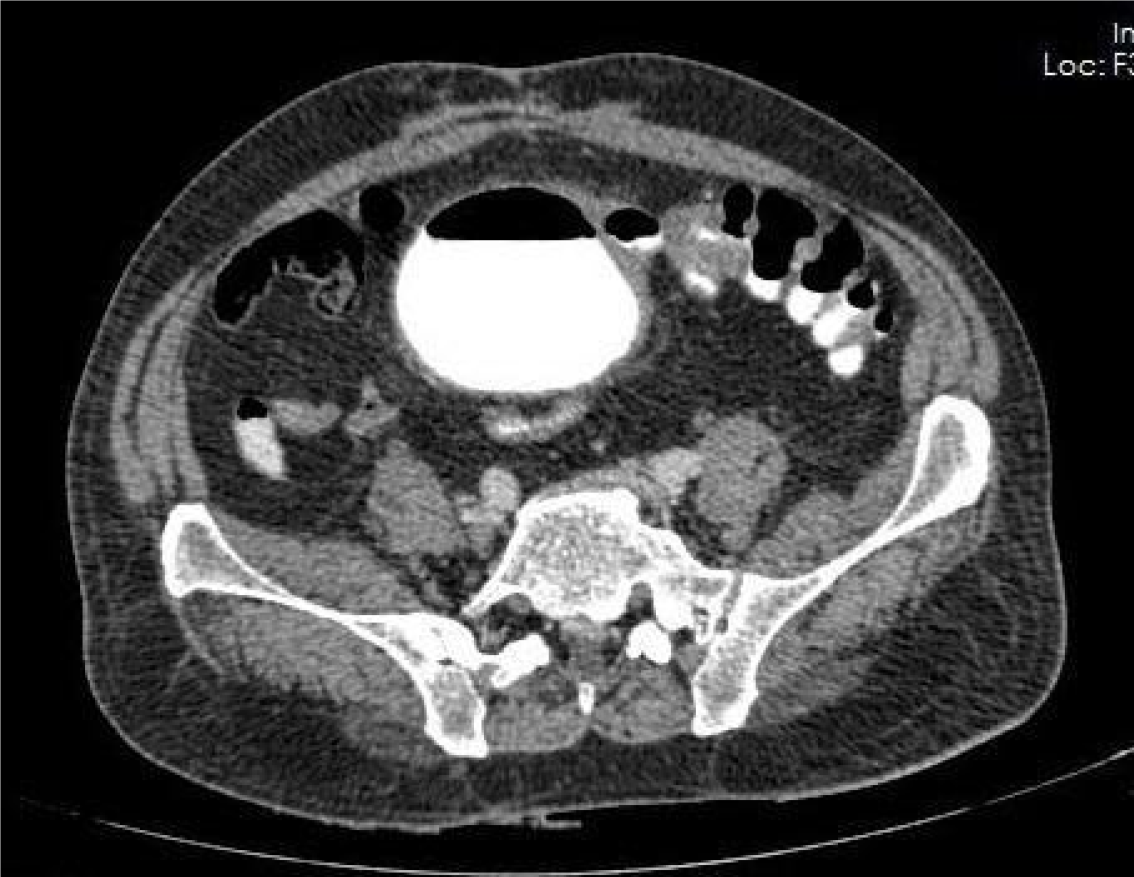 Computed tomography scan showing colovesical fistula between sigmoid colon and bladder (note the presence of gas within the bladder and communication with the sigmoid colon).