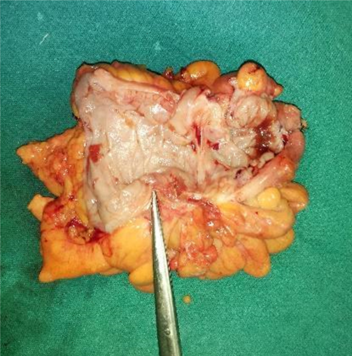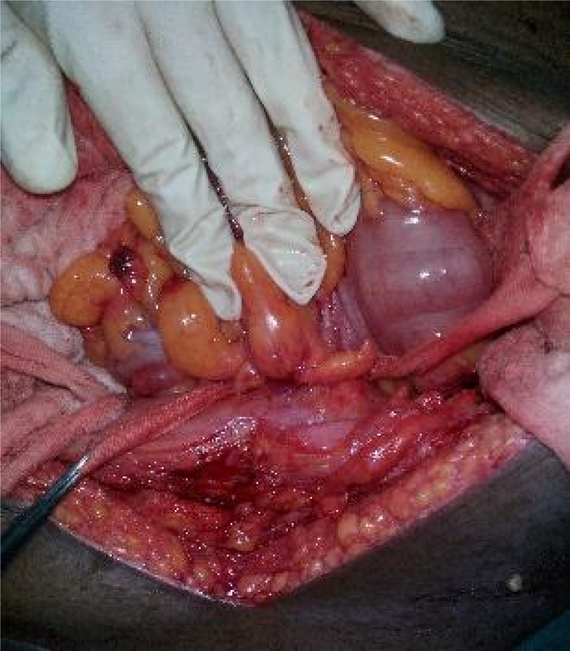 Dense adhesions between the sigmoid colon and the postero-lateral surface of the bladder.
