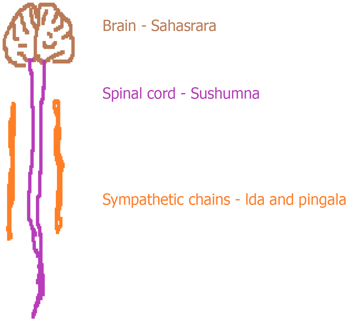 Figure 2 The similarity of yogic knowledge to neuroanatomy; brain with multitude of gyri is described as sahasrara; spinal cord is termed as sushumna; ida and pingala on sides are actually the sympathetic chains.