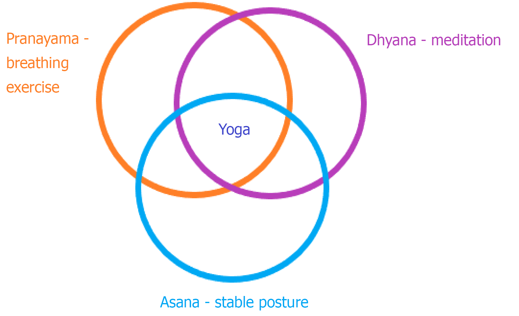 Figure 3 Essential parts of yoga-asana (stable and comfortable posture), pranayama (breathing exercise), and dhyana (meditation).