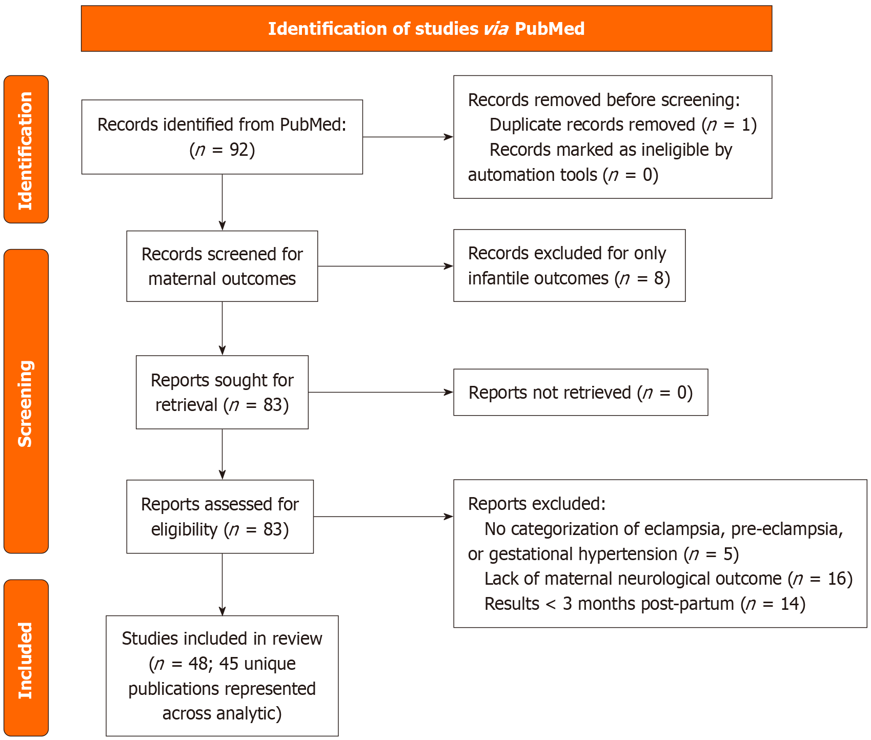 Of the 92 records identified, 49 studies met inclusion criteria after full-text review. Several publications contributed to more than one outcome domain (stroke, structural, cognitive, or mechanistic), yielding 45 unique PubMed records across all analytic tables.